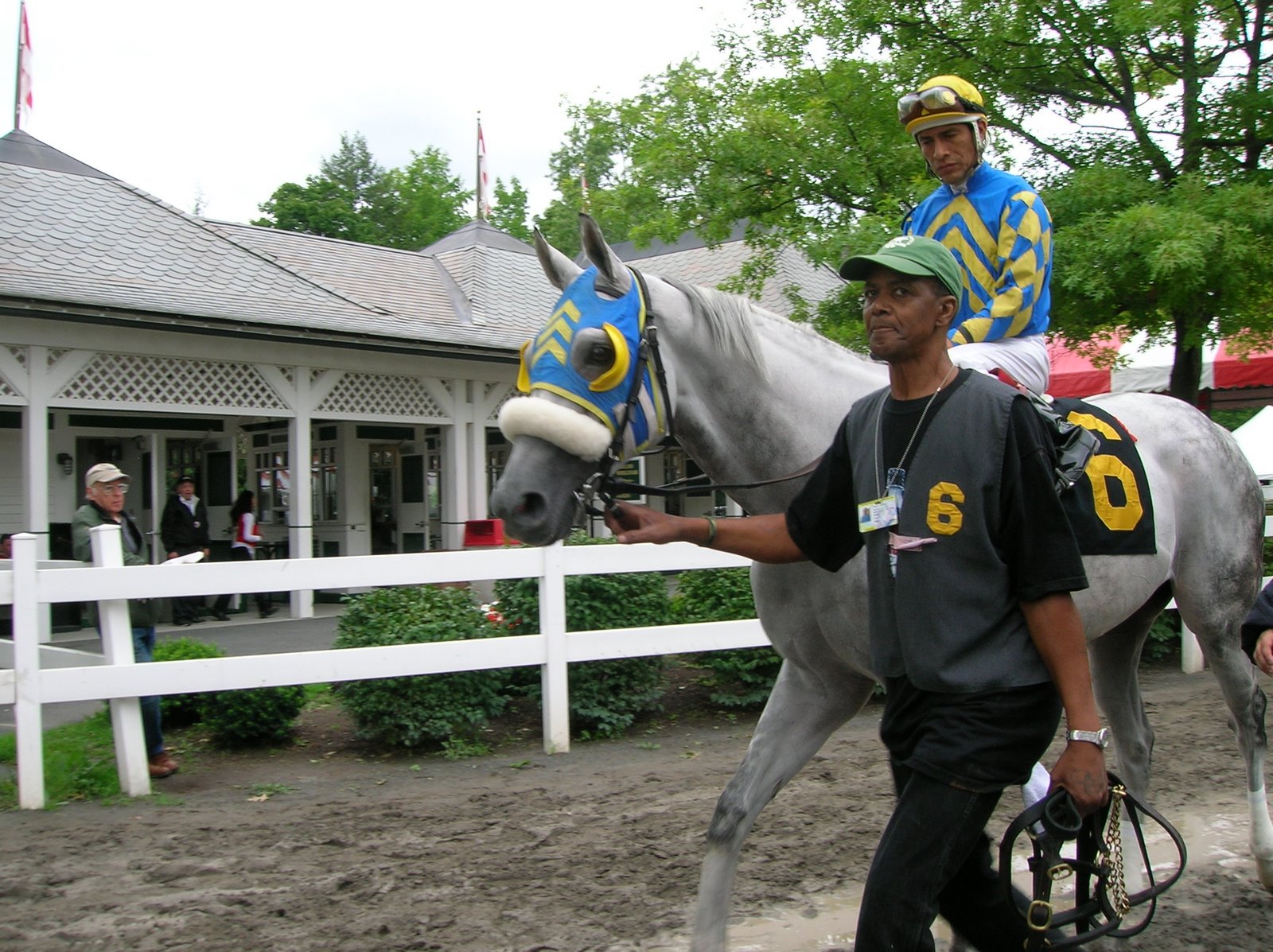 A while back I wrote about Richard Migliore and his decision to take his tack to California last year. Last weekend the Mig was back at Belmont, much to the delight of the paddock fans. They are an active crowd at Belmont, and it’s not uncommon to hear them heckling the jockeys as the jocks walk into the paddock. Many of the folks are Caribbean and sing out to the jockeys in a lilting accent—imagine it if you can: “Miiiiiiiig! Come baaaaaaaaaaack! We miss you, man! Come back to New York! You comin’ back?” The September 1st issue of Thoroughbred Times quotes Mig as saying when he came back to Saratoga for a weekend this summer: “What a welcome I got, even walking in. Fans, people I don’t know were coming up and hugging me and saying they miss me.” He was up at Suffolk yesterday, getting second on Fairbanks in the big race.