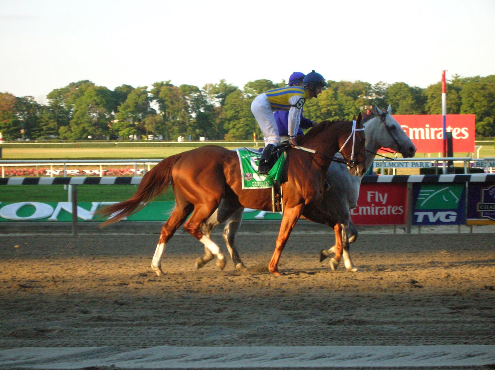 Today’s race is another one that we’ll remember for a while, not least because we saw Curlin do in the Belmont stretch what he did three and a half months ago…except this time, his nose crossed the finish line first. The finish was really, really exciting, and the crowd just threw itself into the moment, exulting in Curlin’s victory and applauding his trot to the winner’s circle. I suspect that they would have done the same if Lawyer Ron had won.