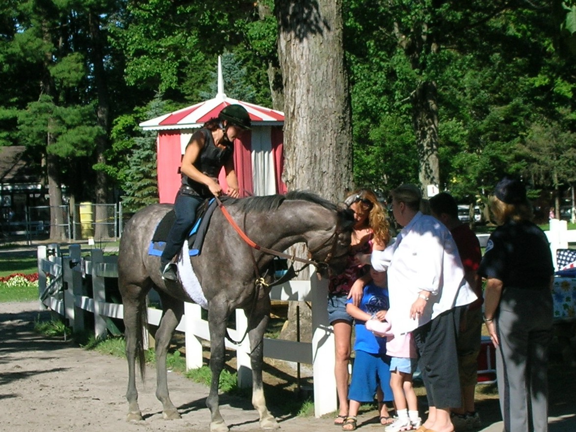 There was a wonderful “only at Saratoga” moment as I walked to the car; a horse was coming out of the paddock on its way back to its barn, and its exercise rider paused by a small group of people along the rail; she let them and their children pet her mount, a three-year-old, for a good five minutes. She talked at length about the horse (whose name I have forgotten! I may remember enough to find it out later today) as he pawed the ground and relaxed his head onto the shoulders of the onlookers. He utterly charmed the whole group before heading off back to his barn.