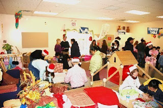 The lobby of Anna House was filled with families and children, signing in with volunteers and making lists of the people for whom they needed to get presents; the party was supposed to start at 1:00, but by the time I arrived, the lobby was so full that the good folks at Anna House decided to get things rolling. I brought a camera with me, but never had a chance to take a single picture; the ones you see here were taken by Anna House staff.
