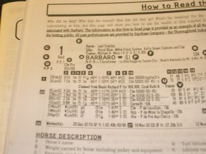 Really? Who knew that Barbaro began his career in France, ran in five claiming races, and ended his career at the Fair Grounds? The introductory paragraph helpfully notes, underlined and in bold, that “The past performance lines used in this How to Read (sic) are not actually associated with Barbaro.” The biographical, so to speak, information is correct–owner, trainer, jockey, race record, etc.—but apparently Barbaro’s pp’s are simply not complex enough to offer useful information to the rookie racegoer. Don’t let that stop you, though—go ahead and make up some stuff, rather than using some real horse whose past performances would have yielded the information the program editors sought. It kind of reminds me of those cheap essays that begin, “SEX! OK, now that I’ve got your attention, let’s talk about floor cleaner…”