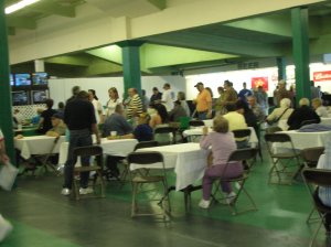 As an Aqueduct habituée, I am used to decrepit physical plants; ACRC is less decrepit than…temporary. The ground floor of the grandstand offered plenty of seating in the way of folding tables and chairs set up throughout, and at least one of the snack bars was a fundraiser for a local organization (a school?), with participants selling pretzels and bags of candy.