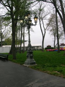 Delaware Park is really beautiful. Better in April, certainly, than November, and better on a sunny day than on my cold, damp recent visit, but even in gloomy weather, the splendor of the track and its facilities is evident. Walking in from the parking lot, one enters the Grove, a beautifully landscaped picnic area on the clubhouse turn containing a play area for kids, a concession stand, a tent available for rental, picnic tables, and these amazing lamps.