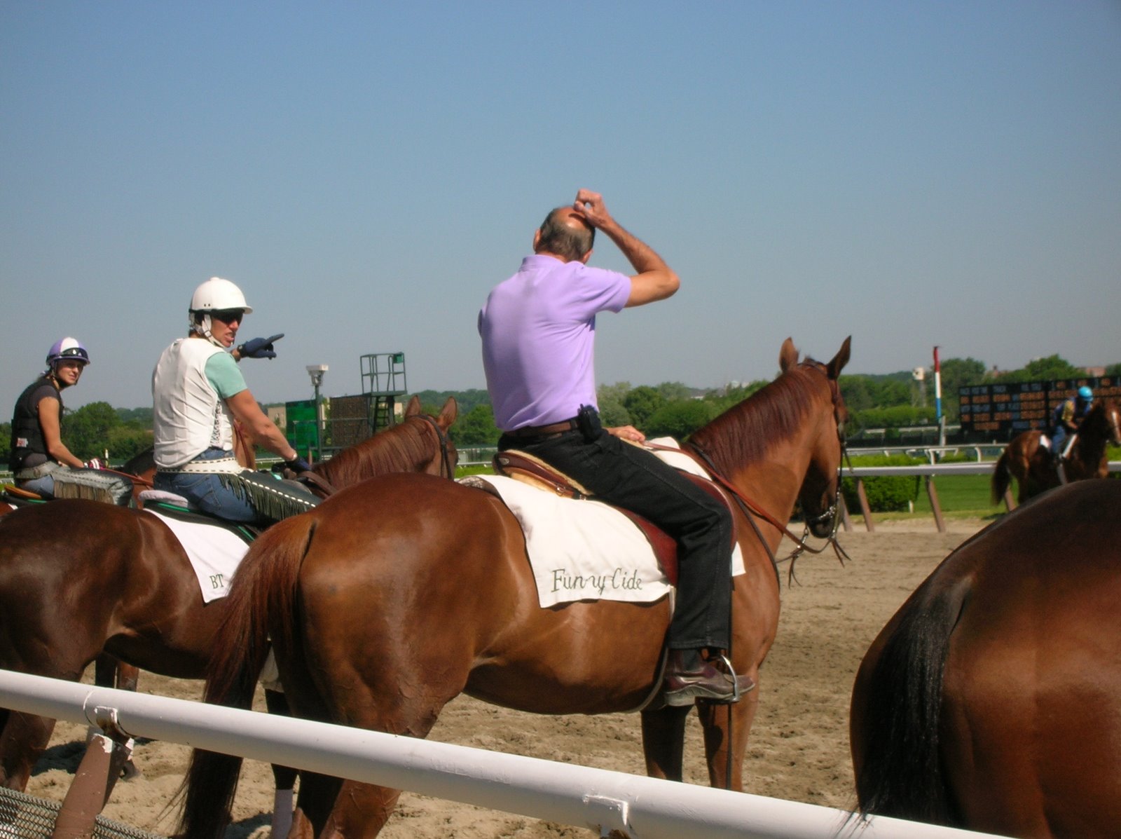 We missed Evening Attire’s workout Monday morning, but caught Funny Cide with Barclay Tagg aboard, as Tagg supervised his horses working out. Maybe one of these horses waiting patiently to work is Tale of Ekati, who posted an official workout Monday morning?