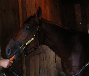 The day after his by-a-whisker loss, Early Response, munching carrots in his stall…