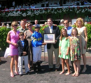 Monday’s third race, in memory of Bob Lee, long-time owner of the Wishing Well restaurant, who died six years ago this week. Lee was also a board member of New York State Thoroughbred Breeding and Development Fund, Inc, and anyone who’s visited his restaurant can see his love of racing in the photos and paintings of horses that adorn the walls. This year’s Bob Lee was won by Premium Gold, John Kimmel’s seventh consecutive winner. I missed Kimmel’s left hand in this photo, but you gotta think he’s holding up two fingers, yes?
