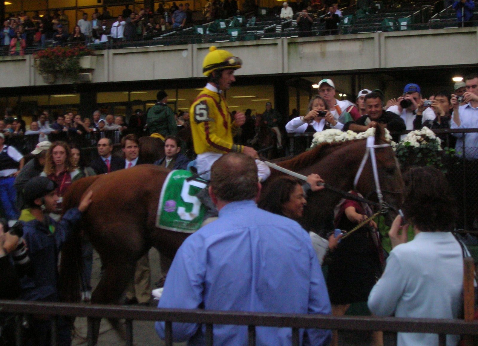 It seemed that the winner’s circle ceremonies went on and on and on…one of the security guards who works the winner’s circle gate here and Saratoga got a big, affectionate, warm hug from Steve Asmussen; Robby Albarado posed endlessly and stopped to receive well-wishers; trophies were handed out; declarations were made. As it got darker and darker, the applause rolled across the apron and rained down from the upper levels; when I rejoined my friends on the second floor, each of us, whether we’d made money or not, or loved Curlin or not, was caught up in a wave of adrenalin, because we got to see something remarkable in the sport that we love.