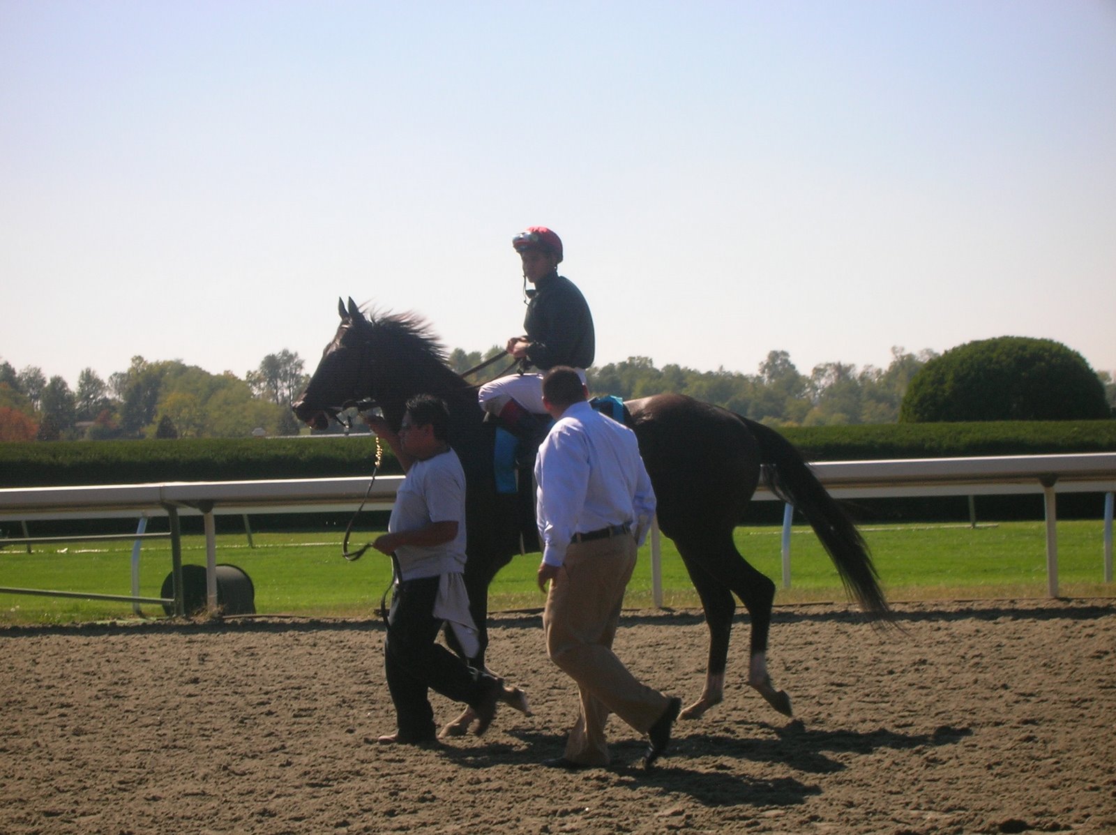 Two events marred an otherwise glorious day. The second race was a starter’s nightmare; even in the paddock, horses seemed agitated, with several washing out before they hit the track (the eventual winner, Inquisitive, was soaked in the paddock—anyone doing any sight handicapping would have eliminated him immediately). I was standing right behind the starting gate as the horses loaded, and watched in horror as Runninforrob reared, flipped, and got stuck under the gate; it felt like forever but took probably only a minute to get him free. As some of the starters worked to release him, others tended to what looked like his badly injured jockey, Juan Enriquez; Enriquez was thrown and must have landed badly, as he couldn’t put weight on one of his legs, ultimately collapsing in the dirt and being carried off the track, clearly in pain, by some of the gate crew. No word on his condition.