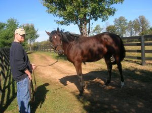As Swain patiently and pleasantly posed for photos, Kent ran down his accomplishments on the track, and those of his relatives, worthy of a post in and of themselves. Fearing that we had already taken up too much of his time, we reluctantly bid farewell to Swain…but when Kent offered to show us some of the other stallions, we accepted with alacrity.