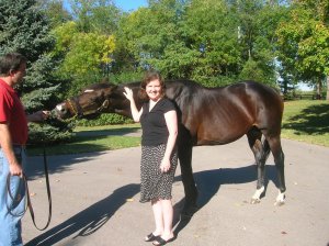 Frank and Erin were there on business, but as Kent brought Swain from his stall, it was almost as if he were bringing out a relative…albeit one who had already impregnated a family member. As we oohed and aahed, Swain performed, nibbling at his lead, stretching out his neck, and finally, we asked, “Can we pet him?”