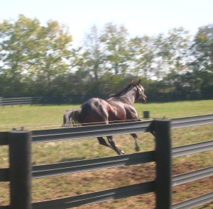 The life of a stallion on a Kentucky stud farm is a thing of beauty, particularly when it’s 80 degrees and sunny. These guys are just hanging out, waiting for January, wondering what enticing fillies and mares will be brought over from Gainsborough, where the Darley broodmares live, for their mating delight…