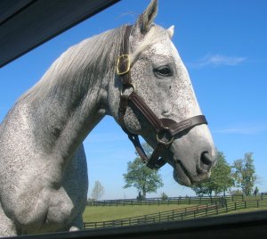 Quiet American is a big Erin favorite, and he was obligingly brought out for us to see. He lives in a paddock near Kafwain, E Dubai, and Offlee Wild. Kafwain and Offlee Wild were brought to their stalls, while Quiet American came to us and E Dubai stayed in his paddock. This was NOT how things were supposed to be, and Quiet American knew it. He knew that E Dubai was still out there, as did Kafwain and Offlee Wild, and those two started yelling out their stall windows (which faced the paddock); Quiet American extended the entire length of that magnificent neck, looking back to see E Dubai, and displaying his consternation in every muscle, every line. “Just WHAT is going on here?” he might well have asked us.