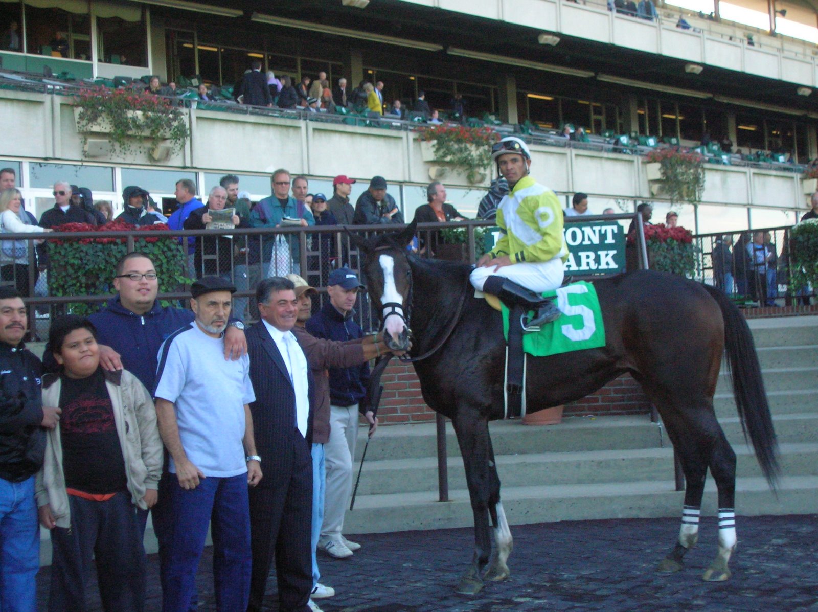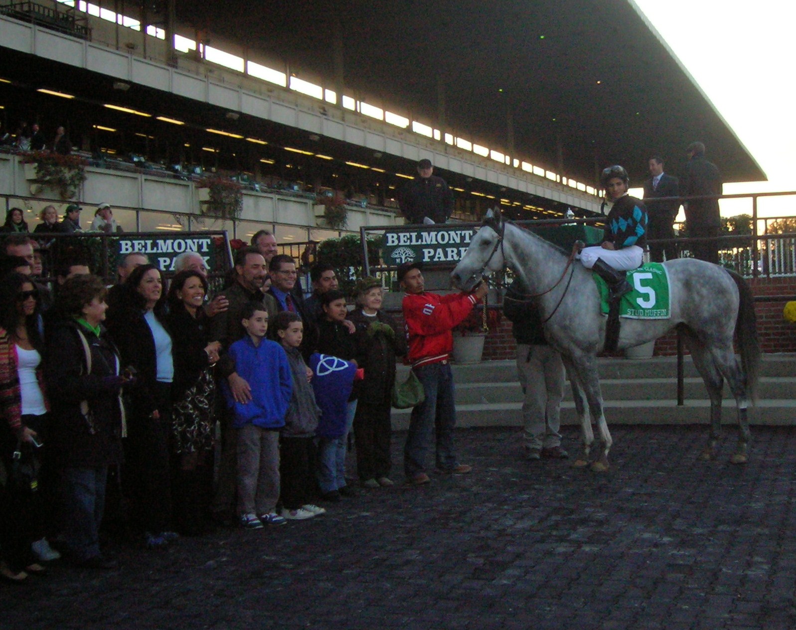 Though only three owners are listed for Stud Muffin, many, many more folks than that were rooting for the grey colt in the Empire Classic as he pulled in front in the stretch. They were jumping up and down and screaming and hugging; I found out later that while they were excited about Stud Muffin’s win, at least one of them had also hit the $2,126 trifecta. As they made their way to the winner’s circle, a woman turned to me (she’s the first woman to the left of the horse) and said, “Look at us! A bunch of ragamuffins in the winner’s circle.” Not a bunch of stud muffins?