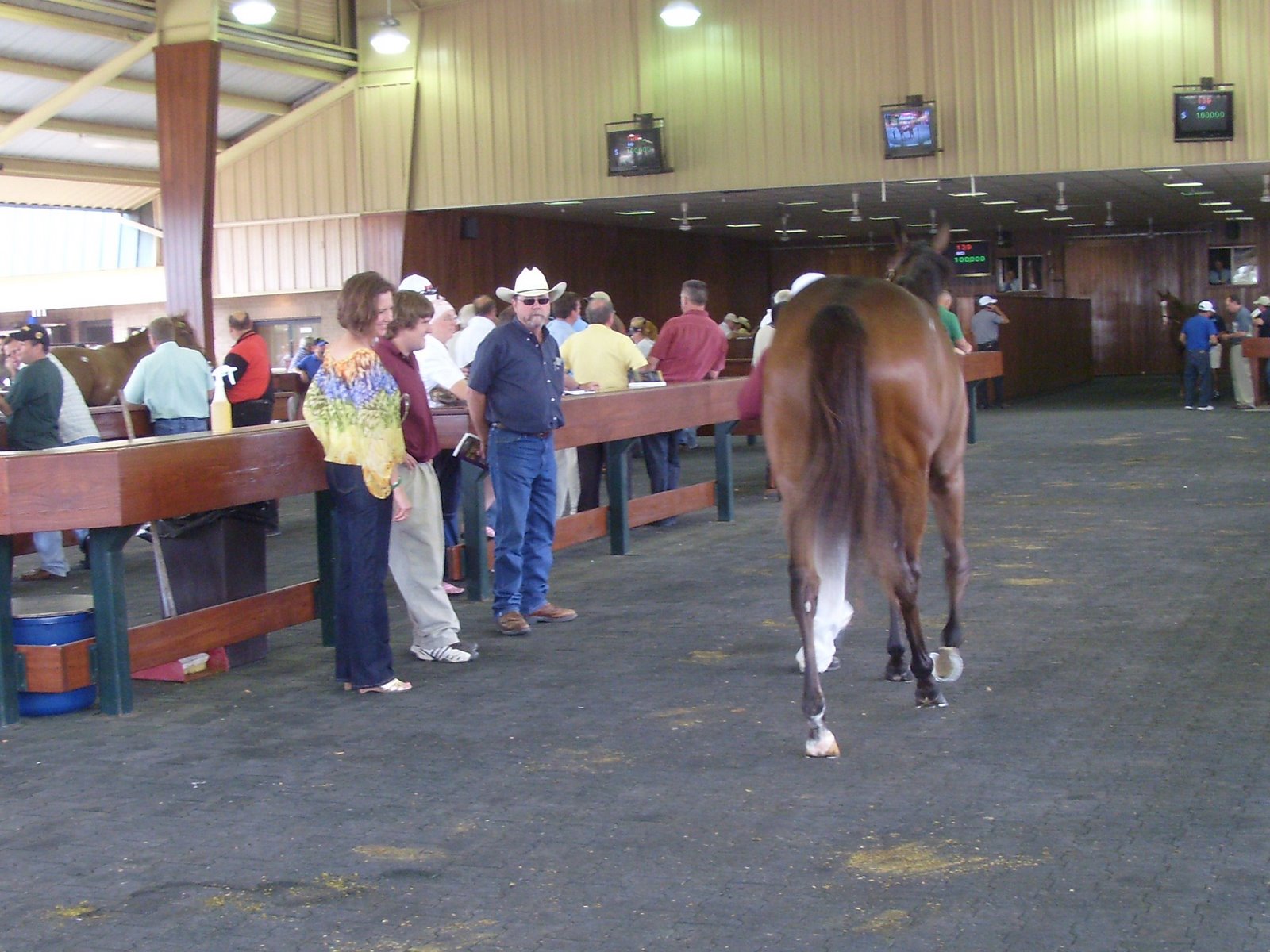 Hip no. 100, Splendid Behavior, goes through the ring. The bidding stops and the dark bay colt hasn’t met his reserve, so back to the barn he goes. Hip no. 145 is being walked near the shedrow, getting ready for her close-up; Crystal is optimistic about this A.P. Jet filly, and undeterred by the non-sale of Splendid Behavior. “We’ll race him, and if he does good, we’ll try to sell him again.” No such worries about the filly, Big Sister; she meets her reserve and then some, selling for $60,000.