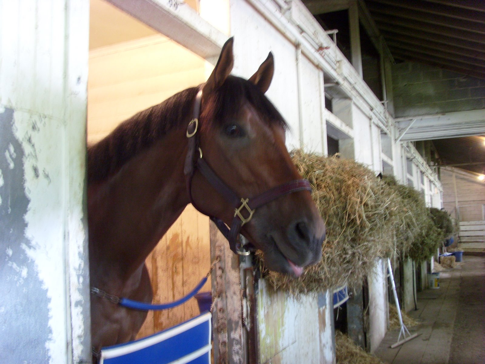 Not only stakes cats and horses get attention today; a final stop at the barn of Jimmy Jerkens yields the opportunity to feed a peppermint to Quality Road (and to wish wistfully that we were seeing him run today), and to be led around by this fellow (female?), though I have been told that this is a “dog barn.”