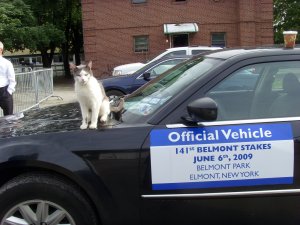 At 8:30 am, outside Barn 18, home of Mine That Bird, the self-appointed Official Cat of the Belmont Stakes holds court. The small assemblage of press pays more attention to the cat than to Chip Woolley. The cat is, according to Steve Haskin, a veteran of Belmont Stakes days; Haskin recalls seeing him at Hard Spun’s barn two years ago.