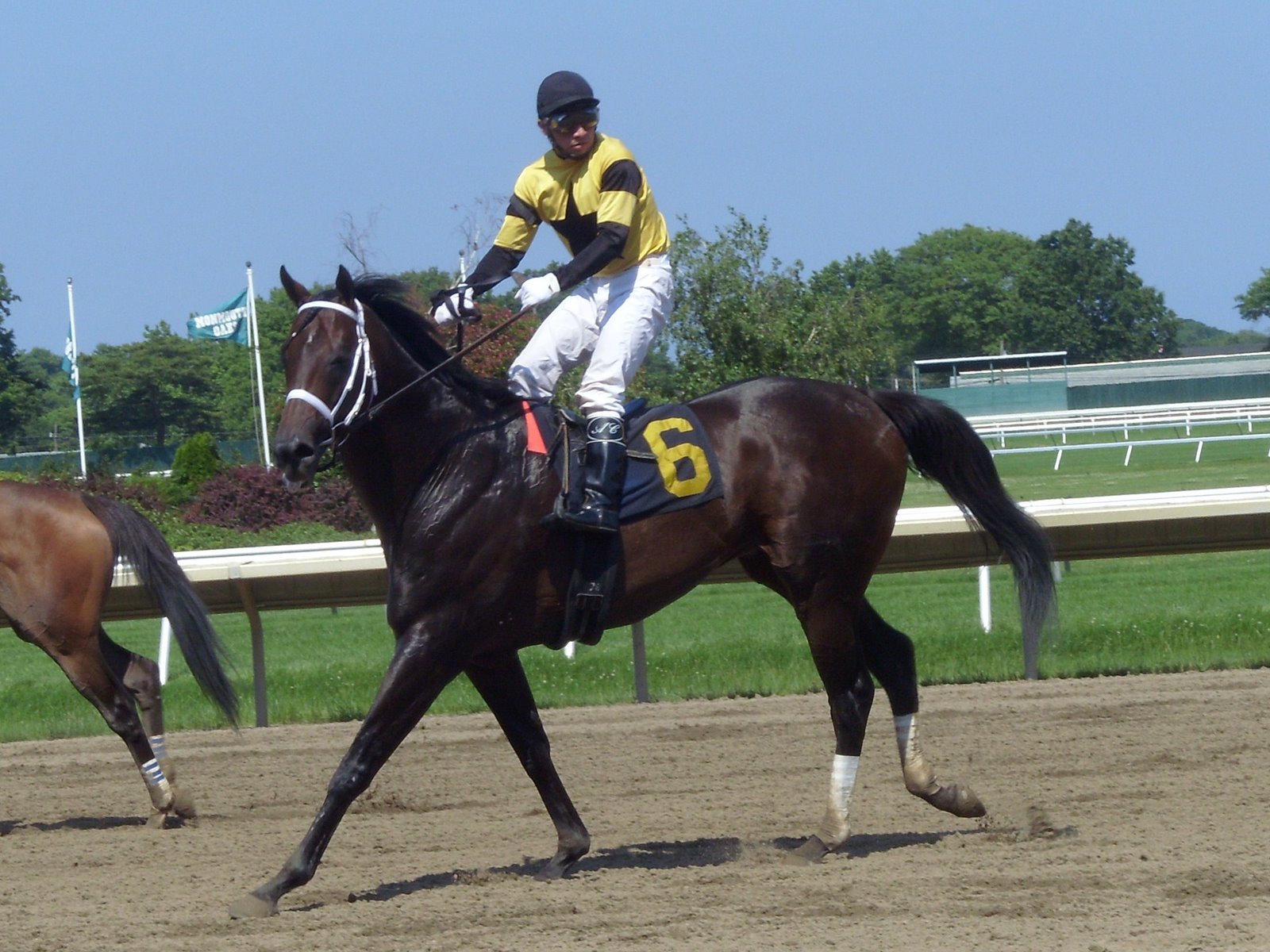 He held the lead until mid-stretch, when he drifted out to the middle of the track; Bythebeautifulsea (there’s a hunch bet for you at Monmouth) came up in the inside and overtook him, winning the race by nearly two lengths. When Saratoga Russell got himself straightened out, he came back a bit, and it seems likely that he’d have won if he’d have remembered to change leads, and if he had stayed straight. Woulda, coulda shoulda.