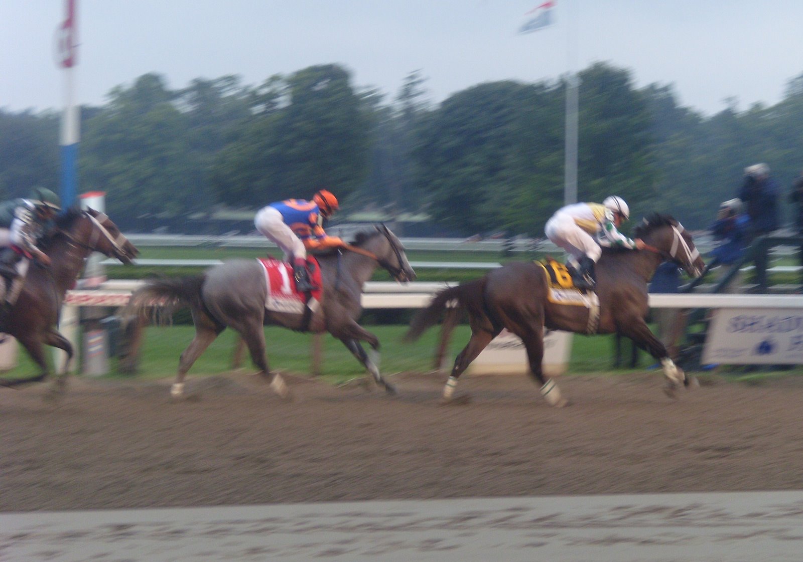 Far more interesting than the call was the incident that occurred as the field comes off the first turn, when an apparently suicidal seagull dive-bombs leader Sebastian Morales, bounces off his helmet, and then hits Julien Lepararoux behind him. You can see it in the video below; a head-on view at the NYRA site gives a better view (free registration require). I advise listening with the sound off.