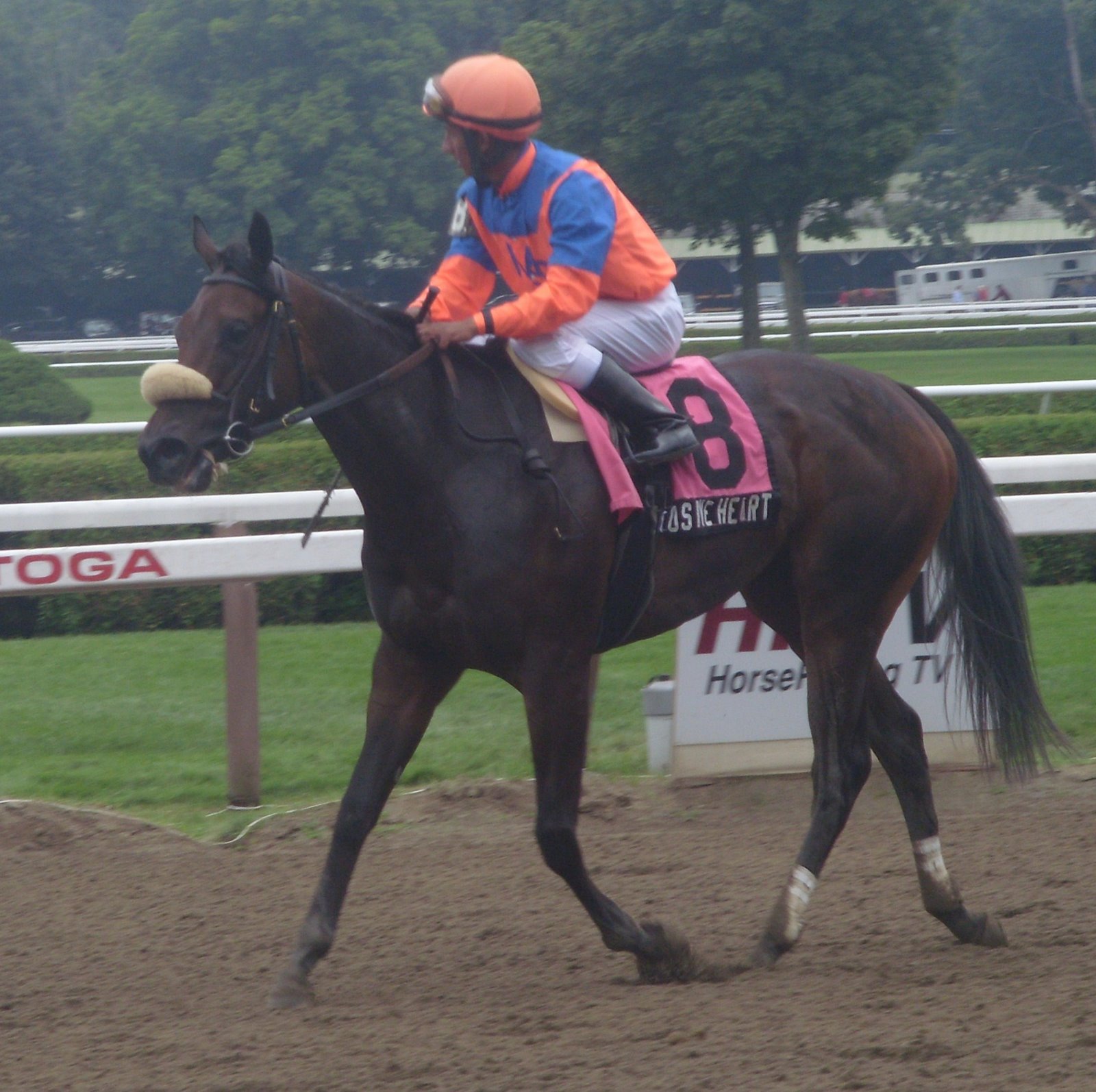 In the fourth race, super-fast filly Elusive Heat wired a field of three-year-old fillies in the Geyser Spring Stakes; zipping through speedy fractions, she was never seriously threatened and won by more than five lengths. She’s just awesome to watch, and it’s too bad that whoever made her saddlecloth thought that her name was Elusive Heart. Oops.