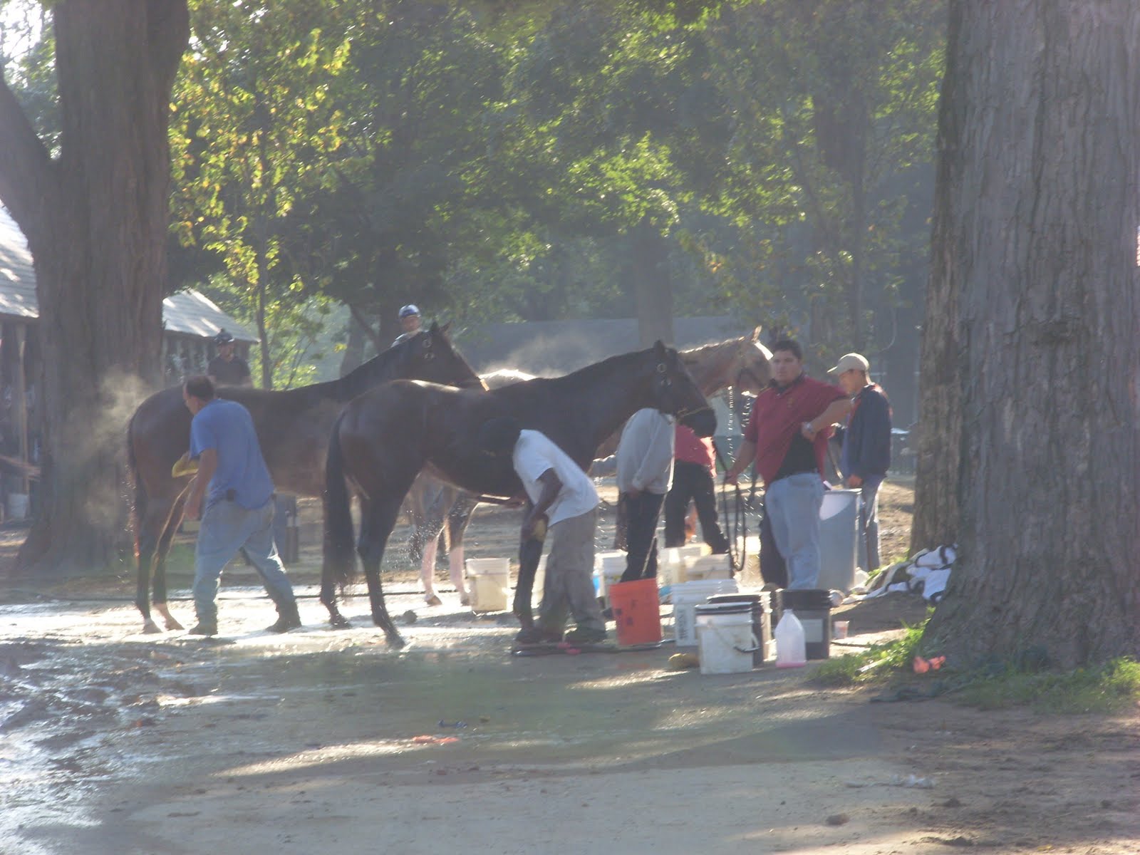 At 6:30 am, the sun is peeking over the trees, but bathing the track and the horses working out over it in golden light. The morning fog without which no Saratoga photograph is complete shows up on schedule, and there’s a coolness to the air that dissipates with the mist.