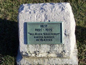 She was the “Coal Black Lady,” nicknamed after a popular song in the 1890’s, a song that was played frequently after her races. She was buried at Hamburg Place in Lexington with other well-known horses; when Hamburg Place was developed, Imp’s grave, along with many others, was moved to make room for a Wal-Mart. Cut all the way across the parking lot, observe a little park, walk down the hill…and there she is: the Coal Black Lady, the Black Whirlwind. Imp.