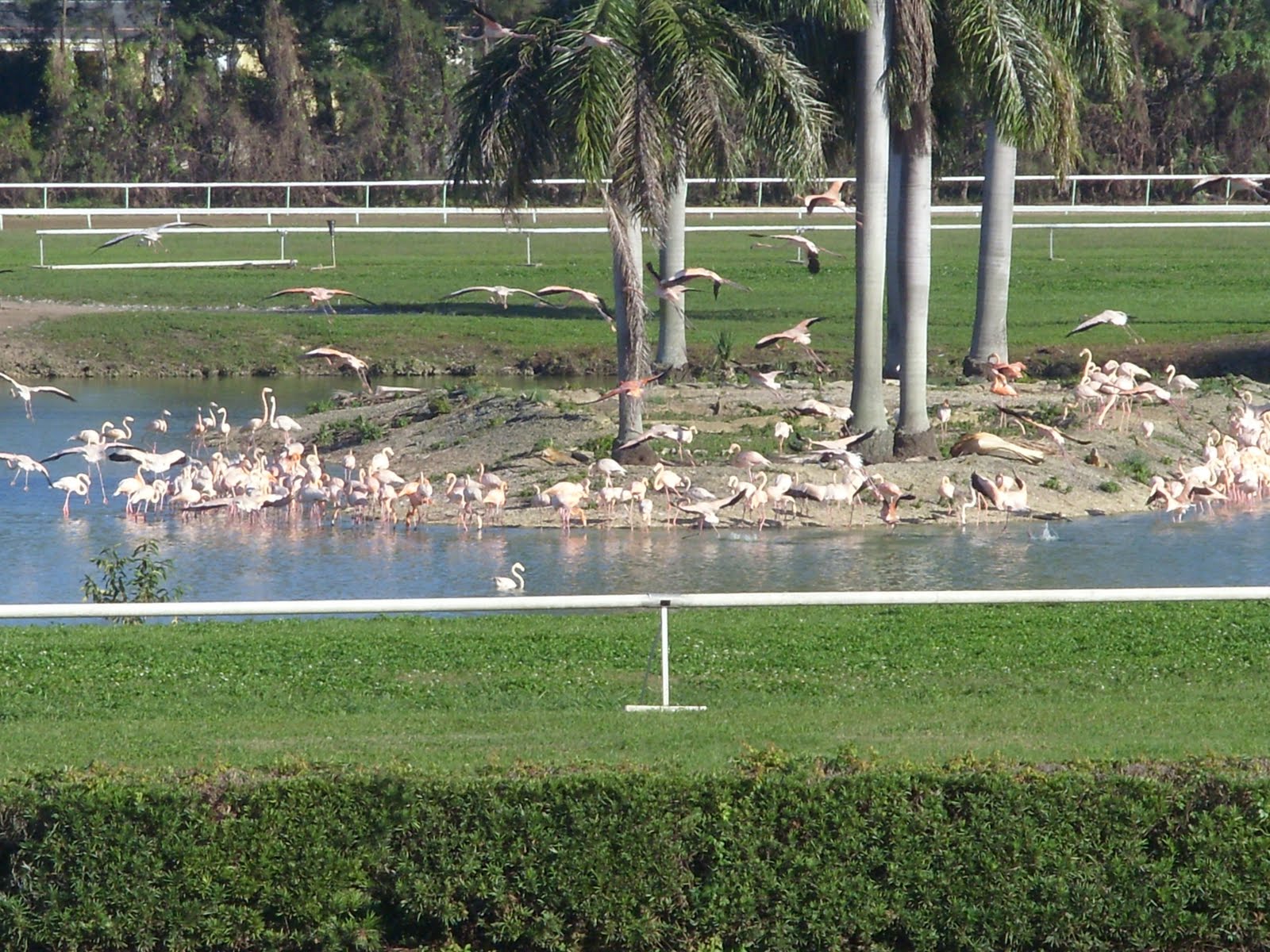 We hurry to an empty clubhouse box—they are nearly all empty—for post time, but our eyes are on the infield. And moments after the race is over, there they go…as they have for so many years, as much a part of Hialeah as the race named for them. (Please forgive the very amateur video–the first I’ve taken.)