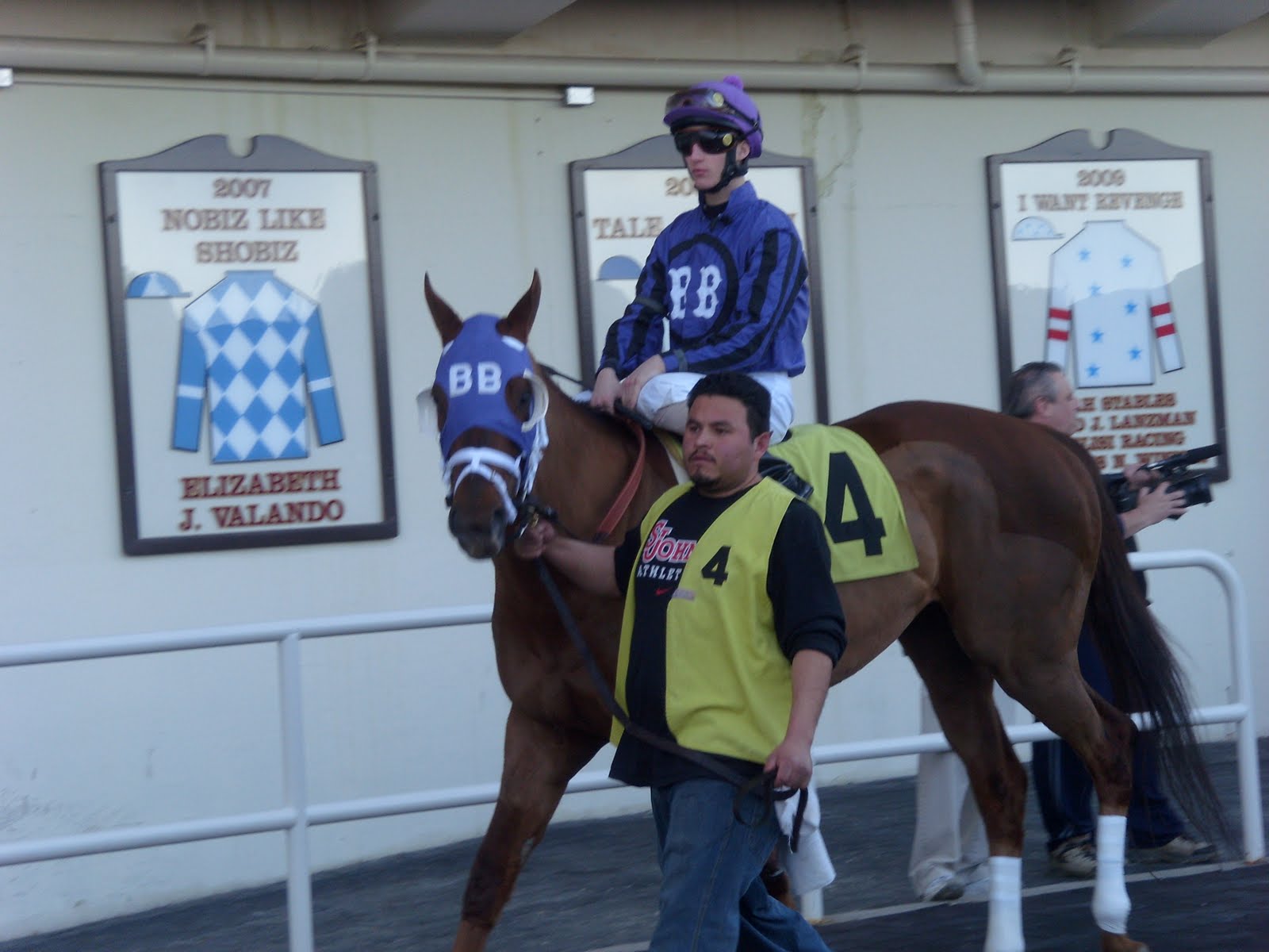 Fun day at Aqueduct on Saturday—really beautiful weather and a great race card brought out lots of fans (hey, 4,000 is relatively “lots”), and many friends turned out to see the first graded stakes race of 2010 in New York. Many good moments throughout the day—two early stakes races, a tantalizing look at a piece of New York racing history (more on that in early May), socializing, a fun new player on the Derby scene in Awesome Act—but right up with all of that was Felinefelon’s win in the seventh race. He paid $14.60, and as Imp had picked him, that $14.60 goes to the Madison fund, which is now up $72.50. It’s pretty cool, actually, how quickly the winnings add up when you don’t deduct the losing. And in perfectly fitting news, Felinefelon is owned by Brooklyn Boyz Stable.
