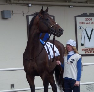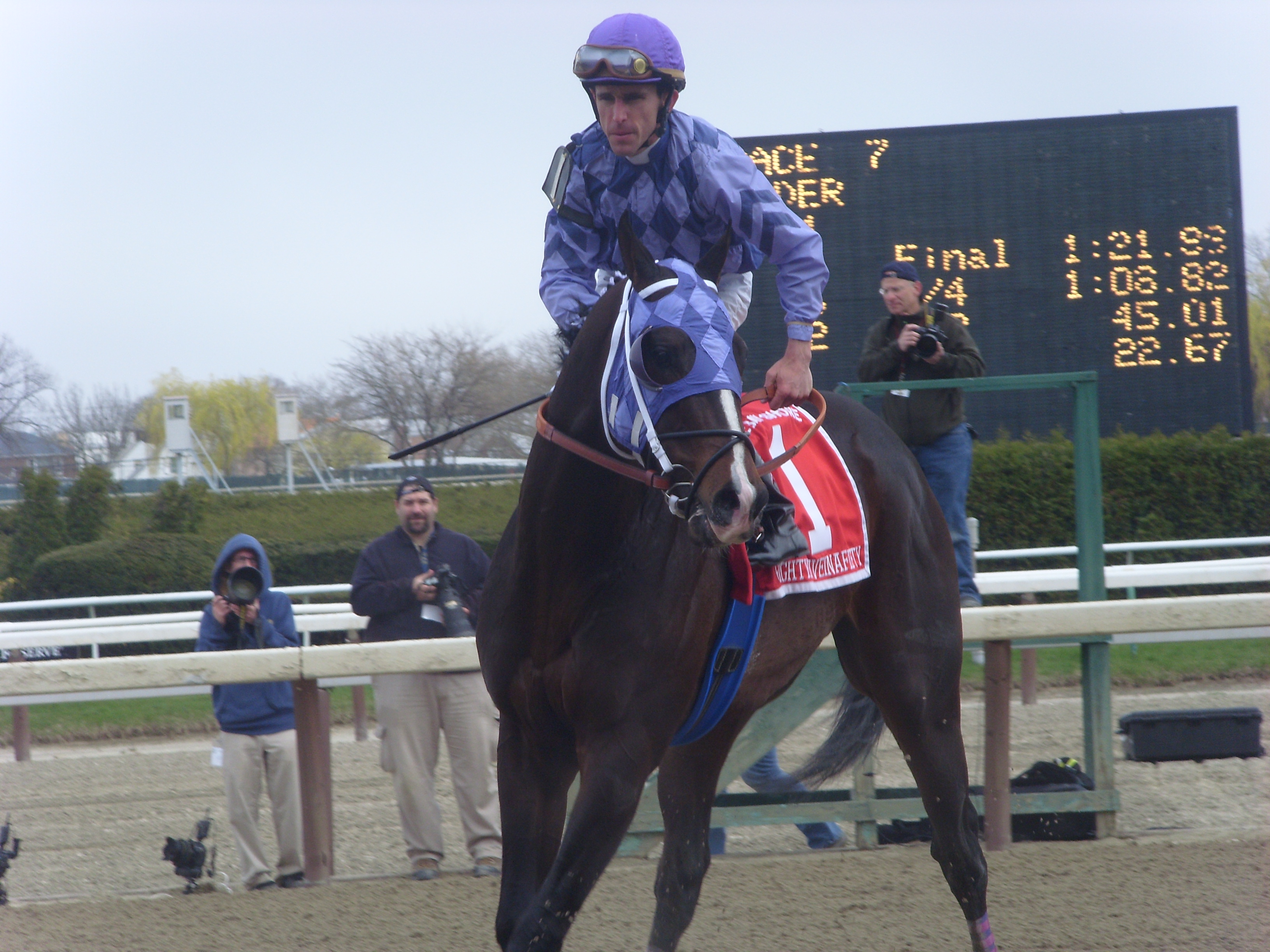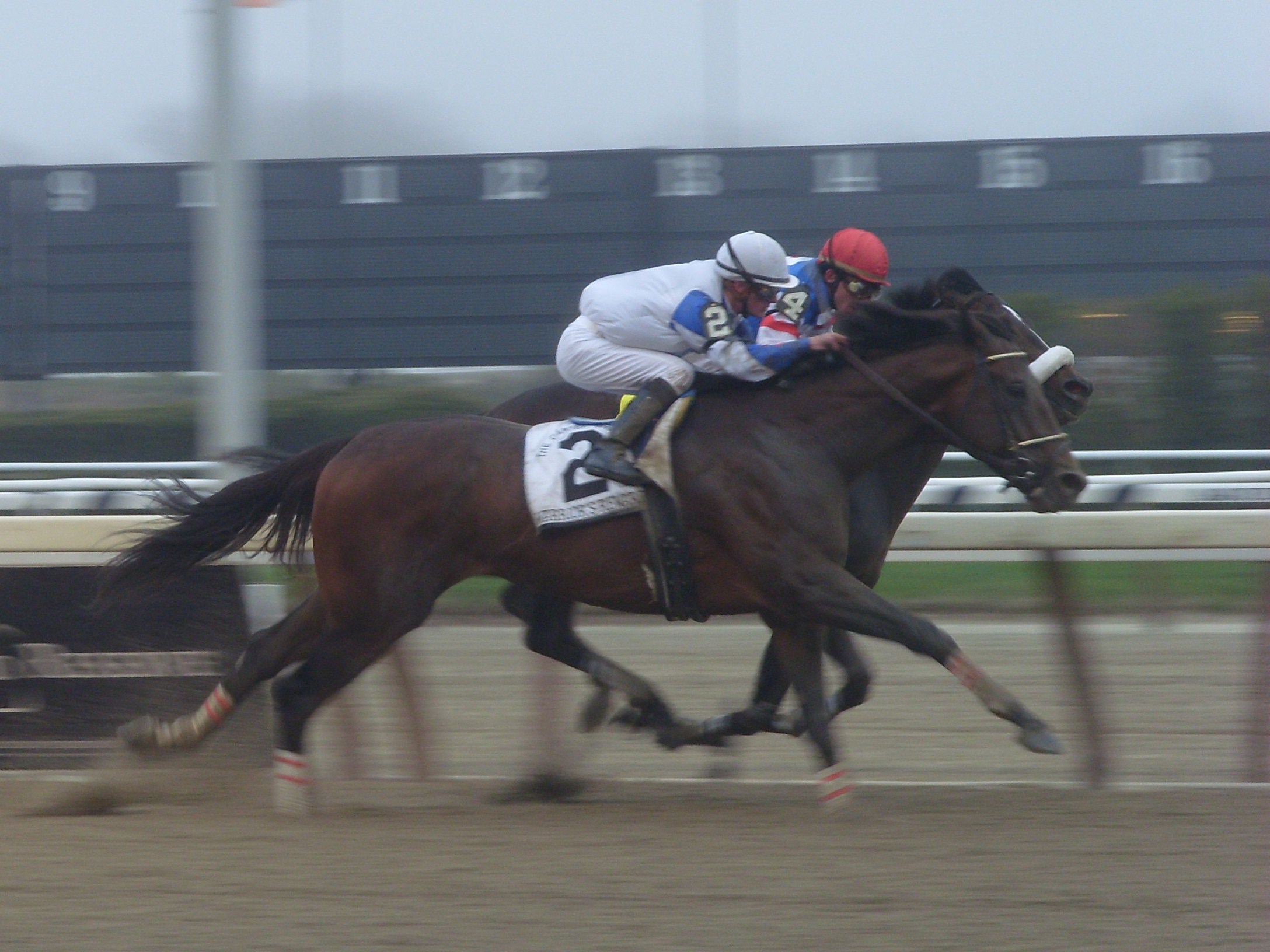 Poor Derek Ryan. Last month he ended up on the wrong end of a photo in the Tampa Bay Derby, when his Schoolyard Dreams (fourth in the Wood) was nosed out by Odysseus; last weekend, his gutsy Musket Man and Ian Wilkes’s Warrior’s Reward hit the wire noses apart (they are seen here a few steps after the wire), and once again, the photo determined that the other horse won. If you’re a “paddock player,” handicapping by looking at horses in the paddock, Warrior’s Reward was the play of the day: alert, majestic, he literally surveyed his competition before the race, and brought the same proud attitude to the winner’s circle.