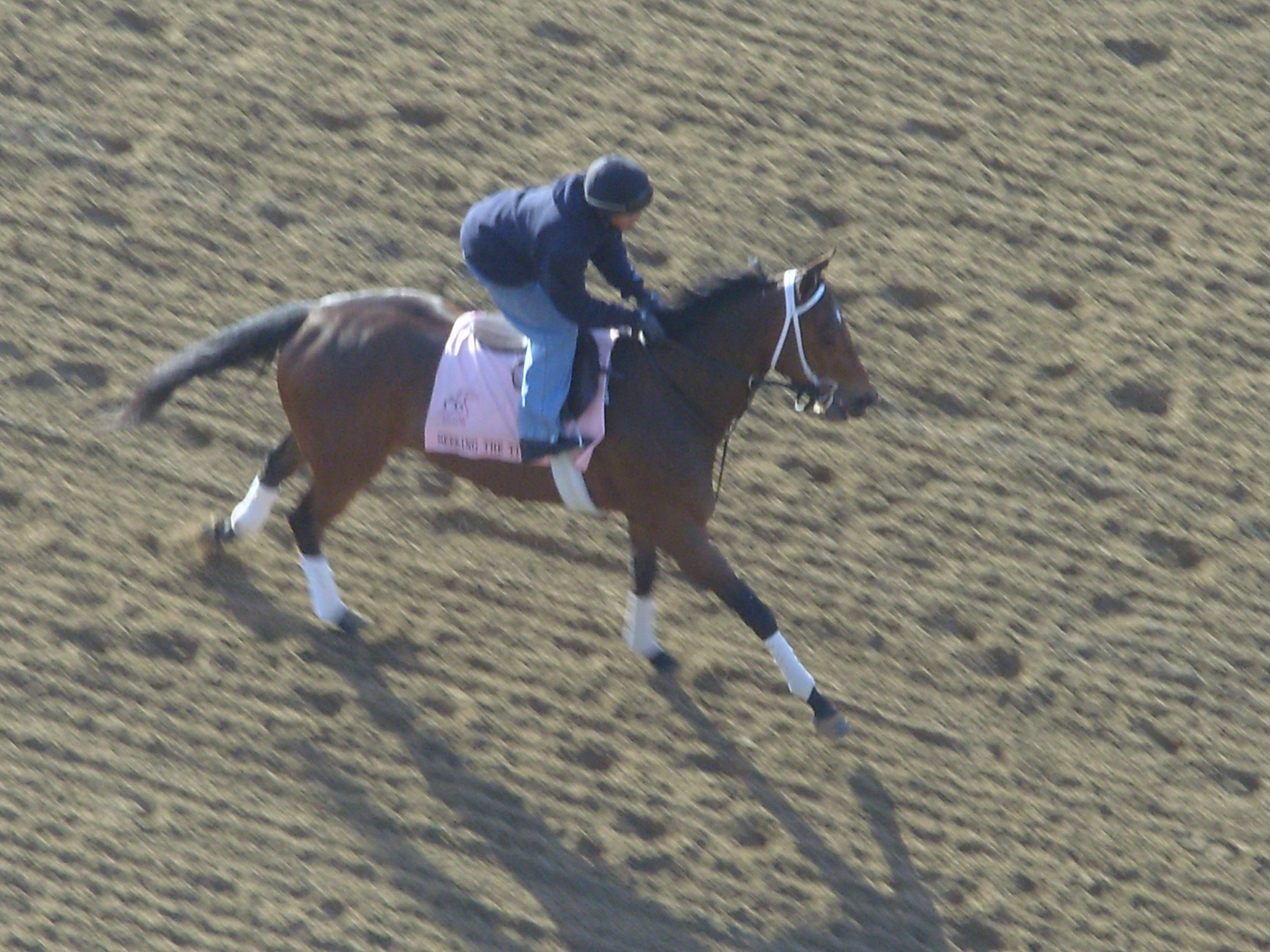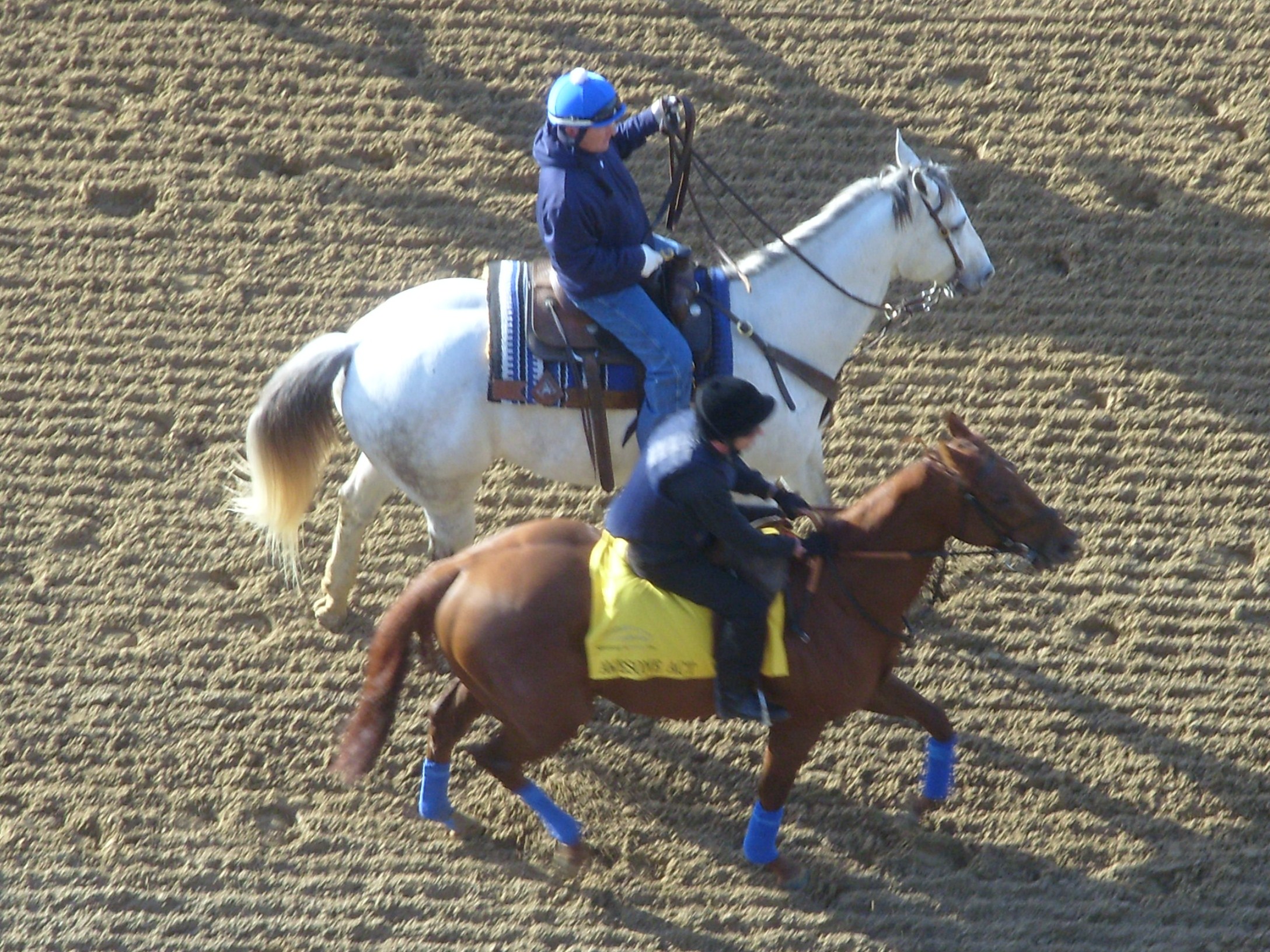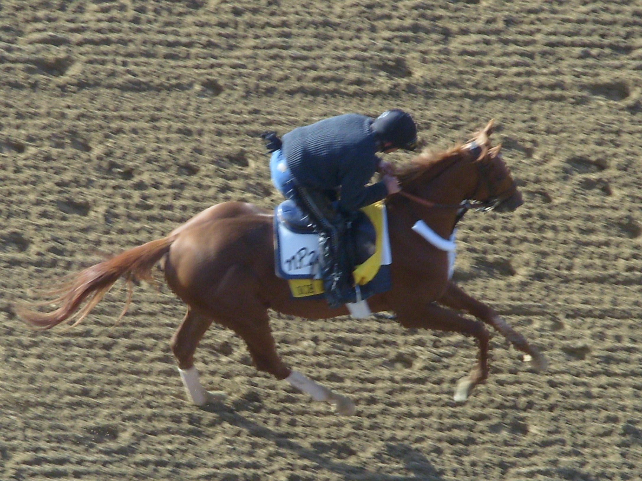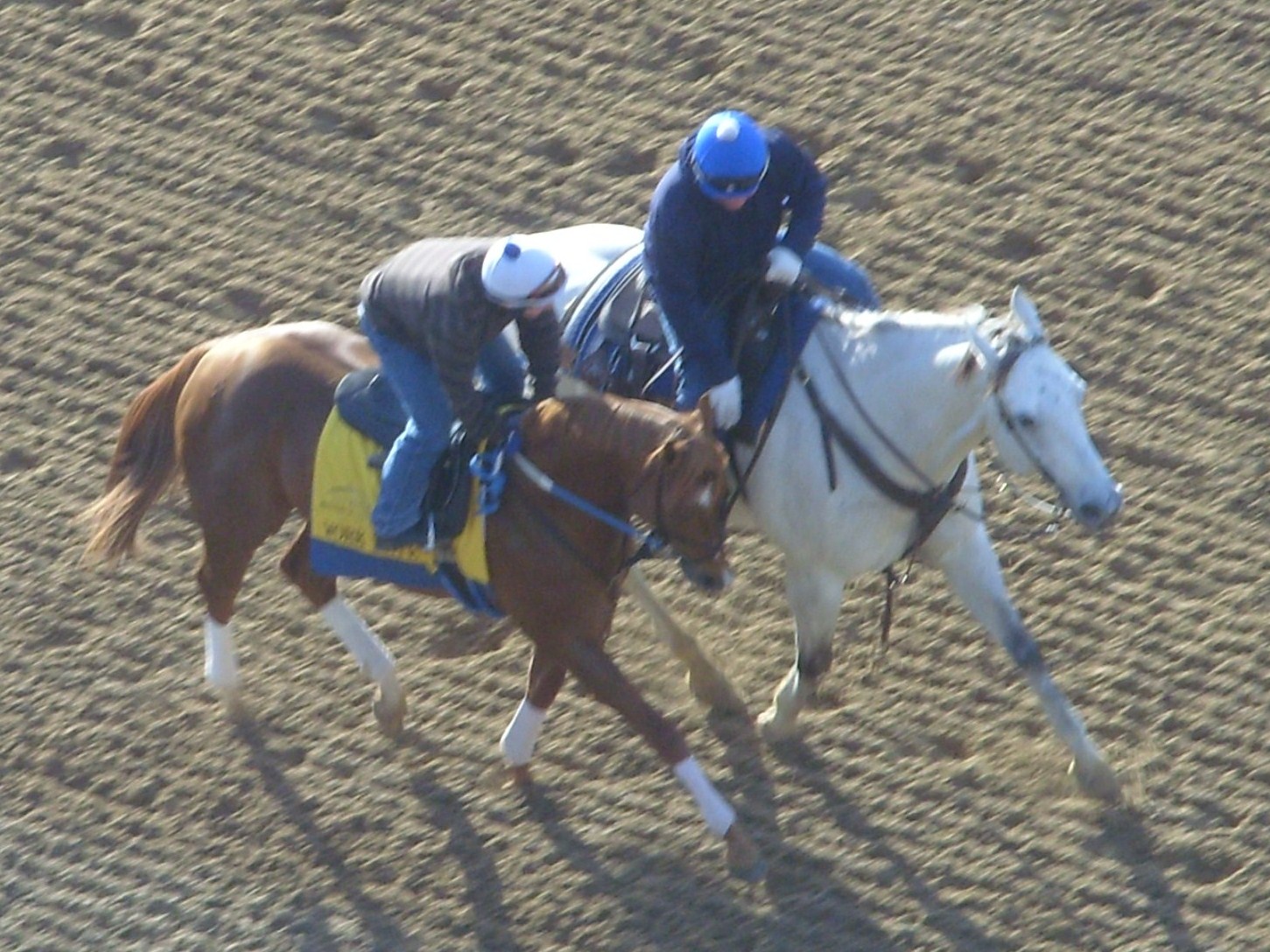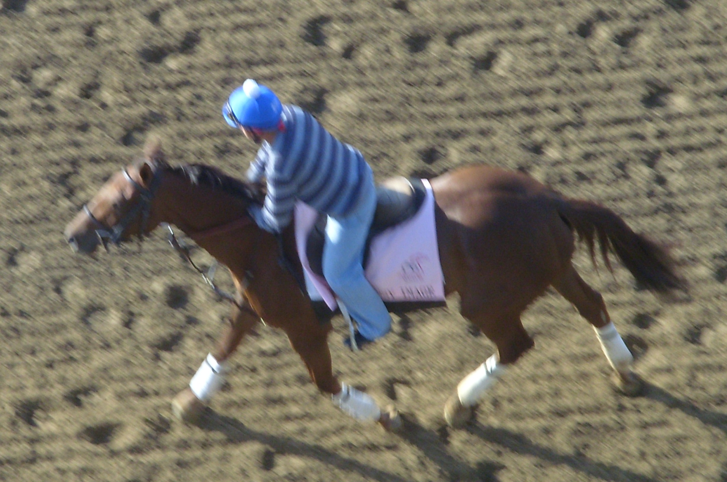 Monday morning, April 19th: It’s been quiet for a little while, but at about 8:25, the stirrings begin. The clockers resume their places: binoculars are raised, stopwatches poised. After a morning of commonplace workouts—oh, except for that bullet that Rachel Alexandra fired at 6:30—the Churchill Downs track is about to become something of a private playground.