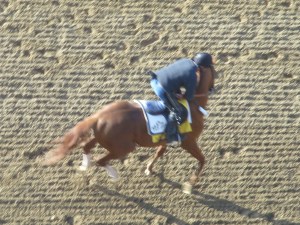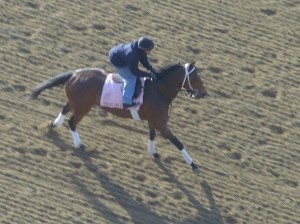 I figured that someday I’d get to Churchill Downs; maybe for the Derby, or, more likely, for a summer afternoon of racing when I would have the place largely to myself. I did not figure that the introduction would take place in the dark at 6 am on a Monday; that my first view of the Churchill track would be from six stories up; that the reigning Horse of the Year would be working out; that it would be two weeks before the Derby. I am not complaining.
