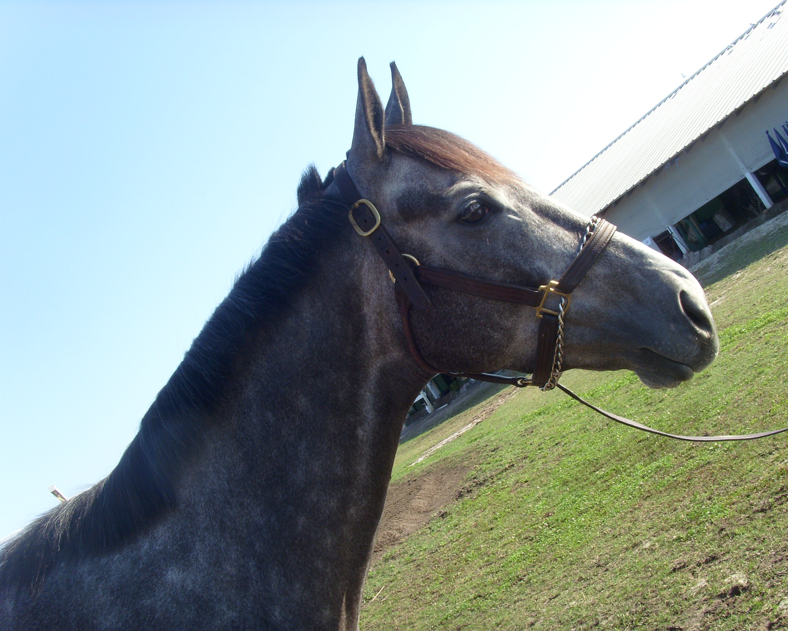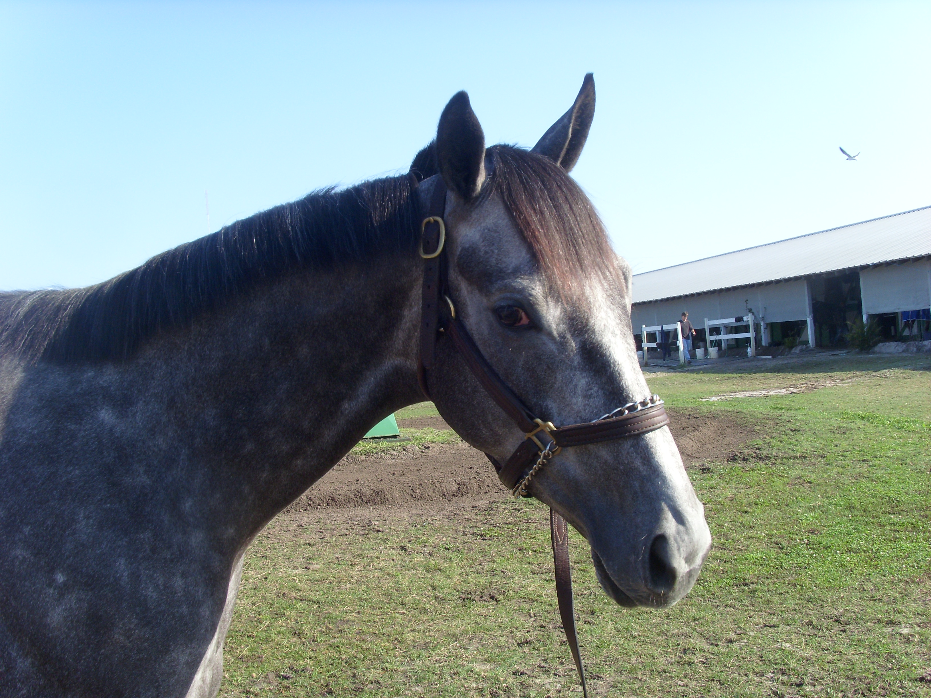 Tabby is a four-year-old daughter of Even The Score (a son of Unbridled’s Song) out of Keeley Chay; she’s big and she’s grey, and gentle as a housecat. She’s trained by Bernell Rhone, and the Rhone family were incredibly gracious and accommodating when I stopped by their barn on a March morning.