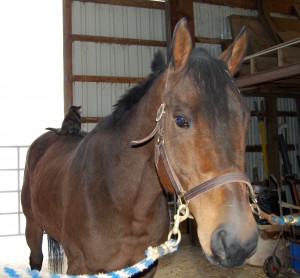 Two weeks after that, she recalls, she was grooming Lucky when a kitten jumped on his back.  “He was totally mellow,” she remarked.  “He’s an incredible horse with a great brain.”