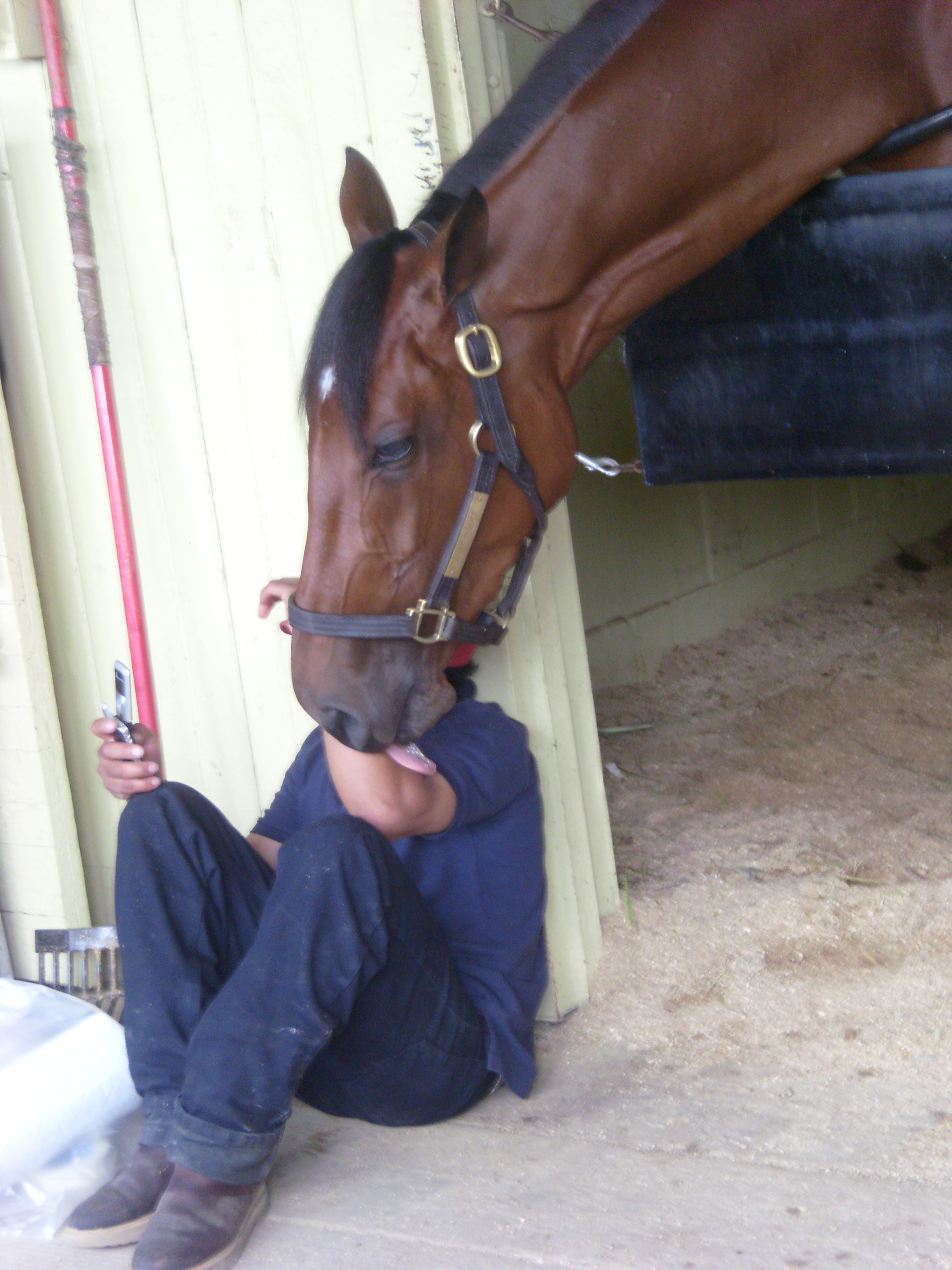 Belmont day itself began early, with a visit to Quiet Temper, First Dude, and Stately Victor, neighbors in barn 1.  Quiet Temper embodied her name, as she nuzzled, licked, and nibbled the groom who sat outside her stall.