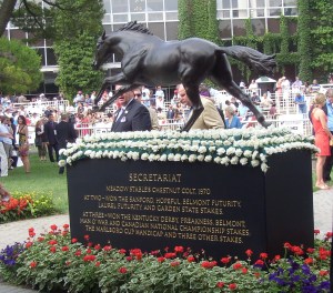 …and yes, the base of the paddock statue of Secretariat has been handsomely replaced, and it never looks better than when it’s draped in white carnations.