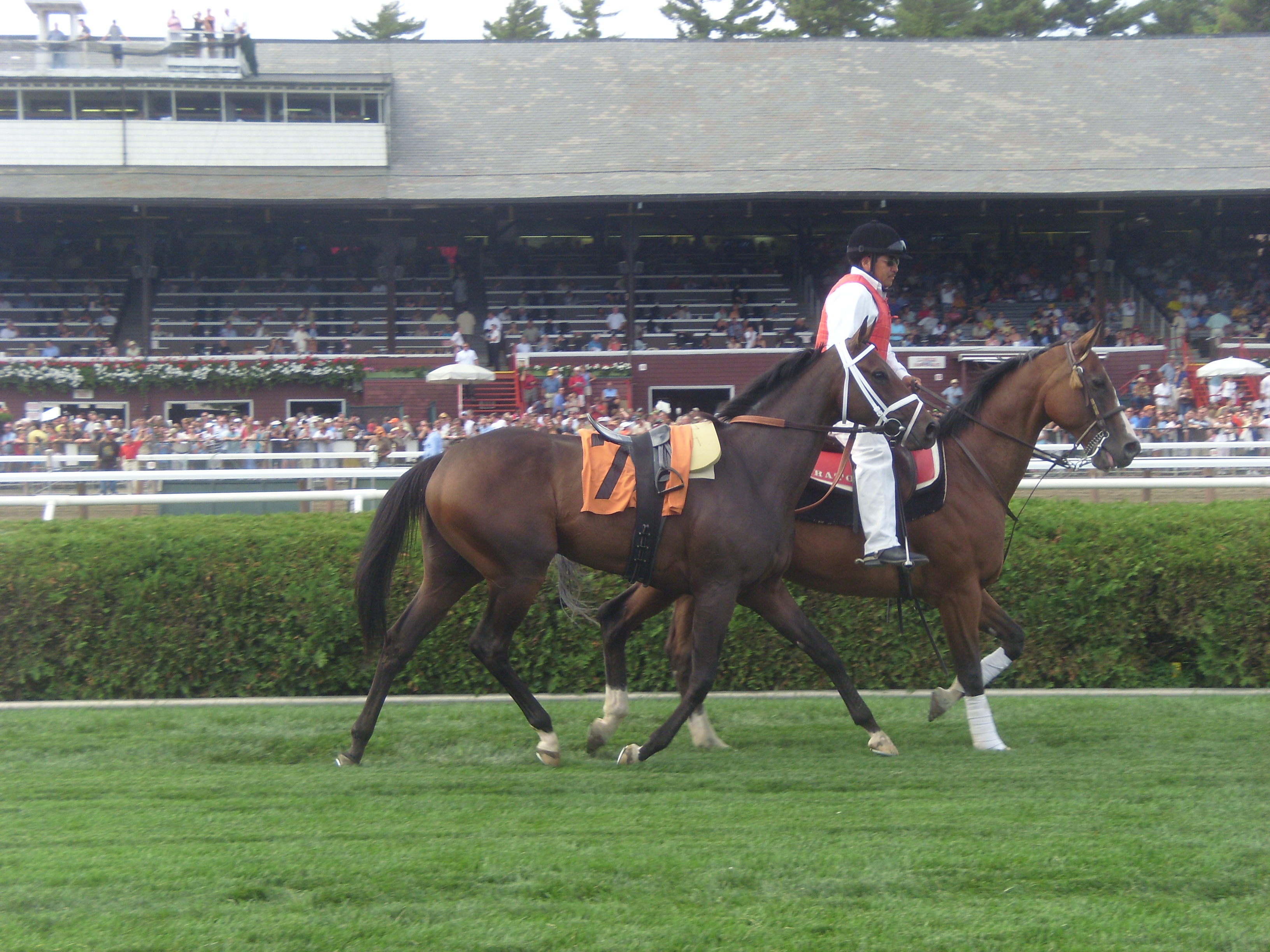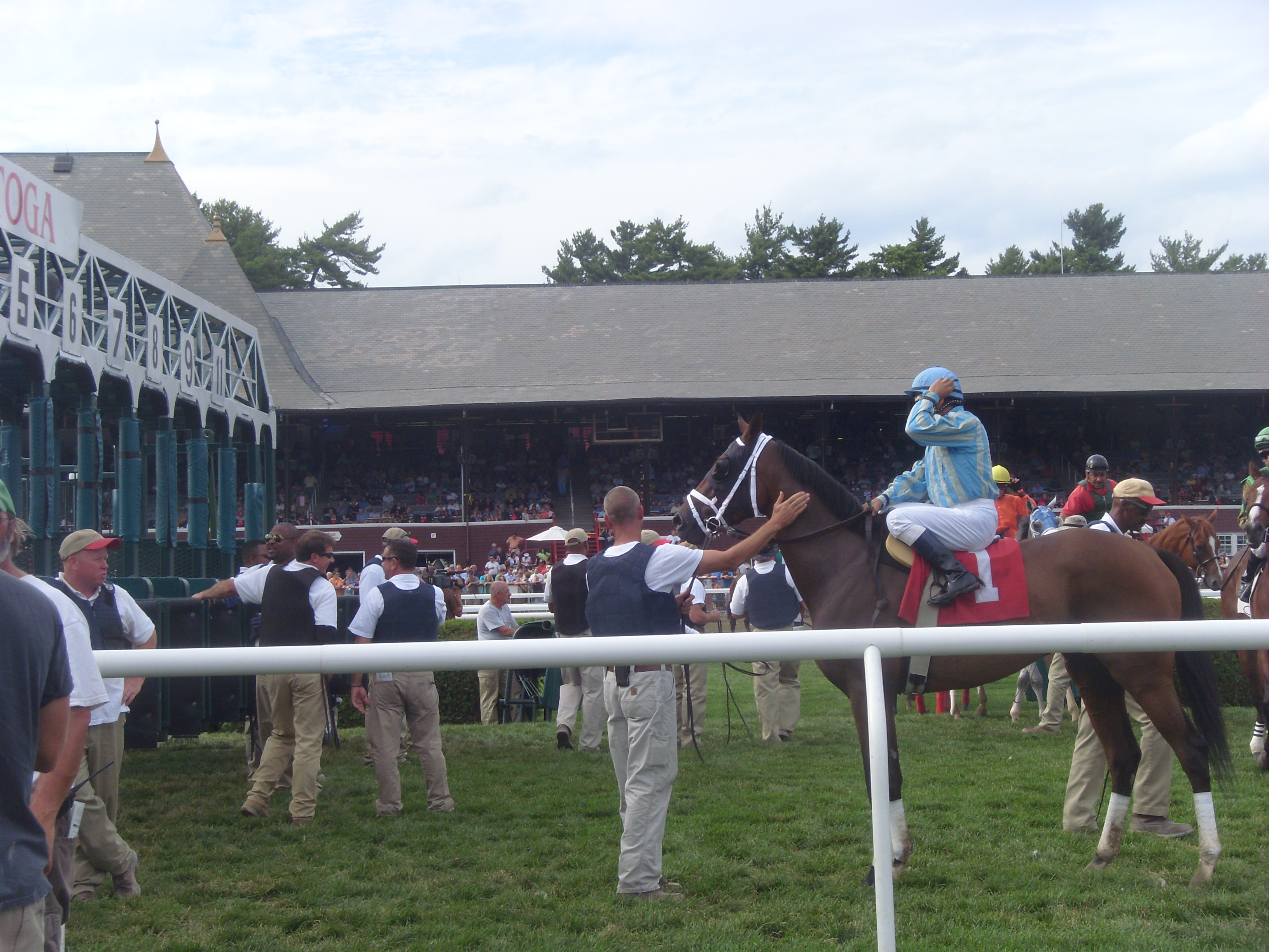 Today, the maidens make it safely and easily out of the paddock; they behave through the post parade. The coast is clear, and we cross the main track. Sandals were not made for the depth of the Saratoga dirt; I have chosen my footwear poorly.