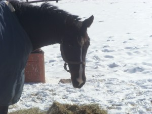 A few months ago, I was reading the newsletter I get from Akindale Farm, and there, about halfway down the page, was listed the name and photo of a new arrival. I’d had no idea what had happened to Good Going Darl, another mediocre (maybe that’s charitable?) race horse who didn’t spend much time in the limelight. But somehow…he got to Akindale, where he now lives in a paddock with a younger, sprightlier fellow, Marvolo, who’s in training for a career as a show horse. Marvolo was nearly slobbery in his enthusiasm at having visitors; Darl, older, jaded, came over for a bit, then settled in with his hay. [Anthropomorphism alert!] He’d look over every once in a while, and nearly audibly sniff, “Youngster,” fully confident in the knowledge that he didn’t need to do anything more than exactly what he wanted…which was to stand still and eat hay. [Anthropomorphism alert over]