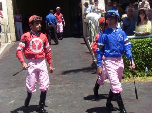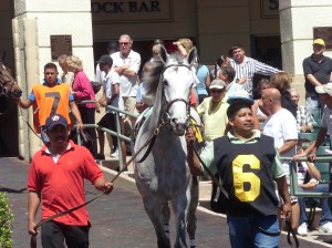 Not that getting Awesome Maria to the post was smooth sailing; obstreperous loading in the gate, Awesome Maria got her own security blanket before she went in the stall. According to the DRF’s David Grening, these are ordinary blankets that prevent the horse’s flesh from touching the sides of the stall, thereby minimizing the horse’s sense of claustrophobia. The blanket is pulled off when the horse breaks from the gate.  This particular accommodation must have worked better than did Unrivaled Belle’s; Awesome Maria was awesome indeed, winning by eight lengths.