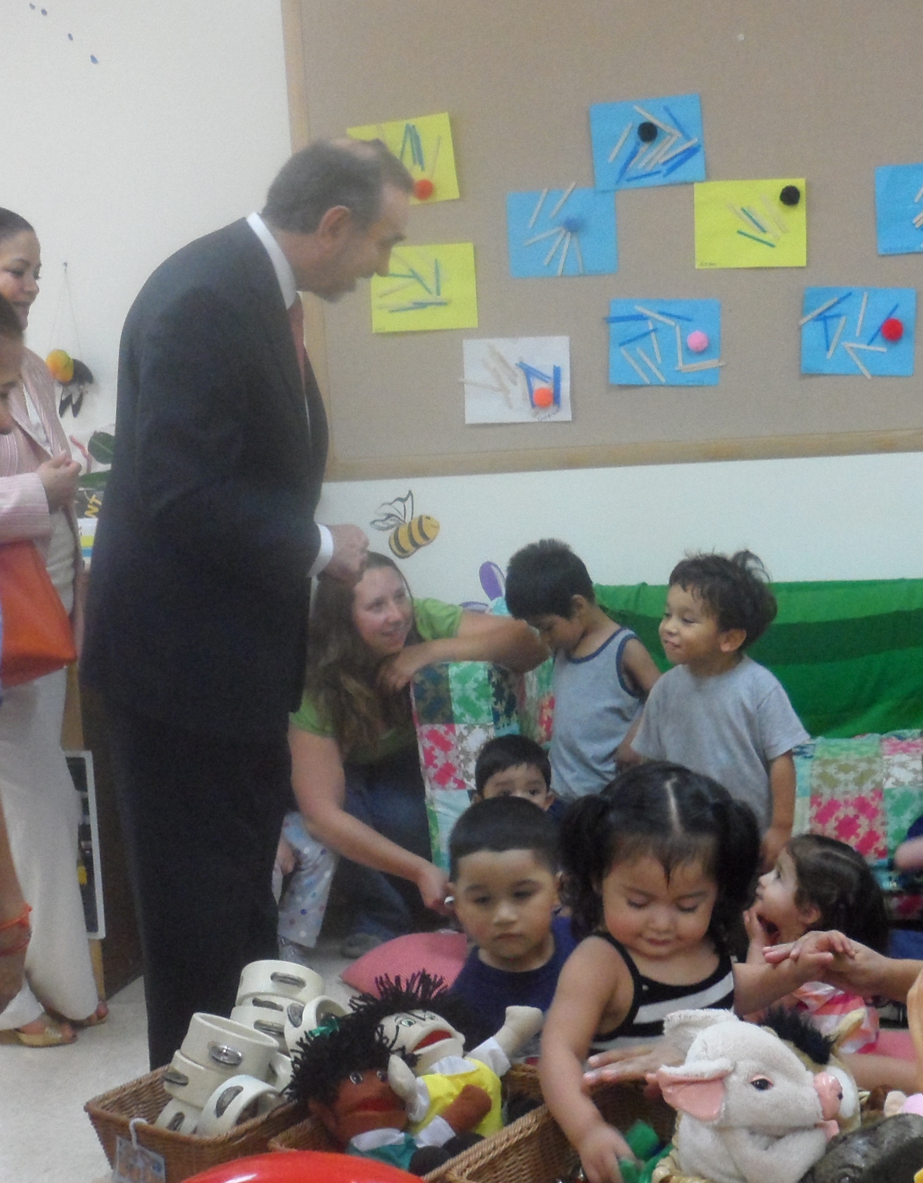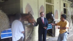 Earlier this week, the Consul General of Mexico, Carlos Sada, and his wife Maria Elena, came to Belmont to visit the backstretch workers and the children. Consul-General Sada was at Belmont earlier this month to assist backstretch workers with visa issues; on Wednesday, he talked to workers in nearby barns and visited with the children. He was joined by BCCA board member and Thoroughbred owner Herb Oster and trainer Ramón (Mike) Hernandez.Consul-General Sada grew up around horses, riding and showing them from an early age; Hernandez was so impressed with Consul-General Sada’s way with the horses in the barn that he offered him a job if this diplomat thing doesn’t work out.