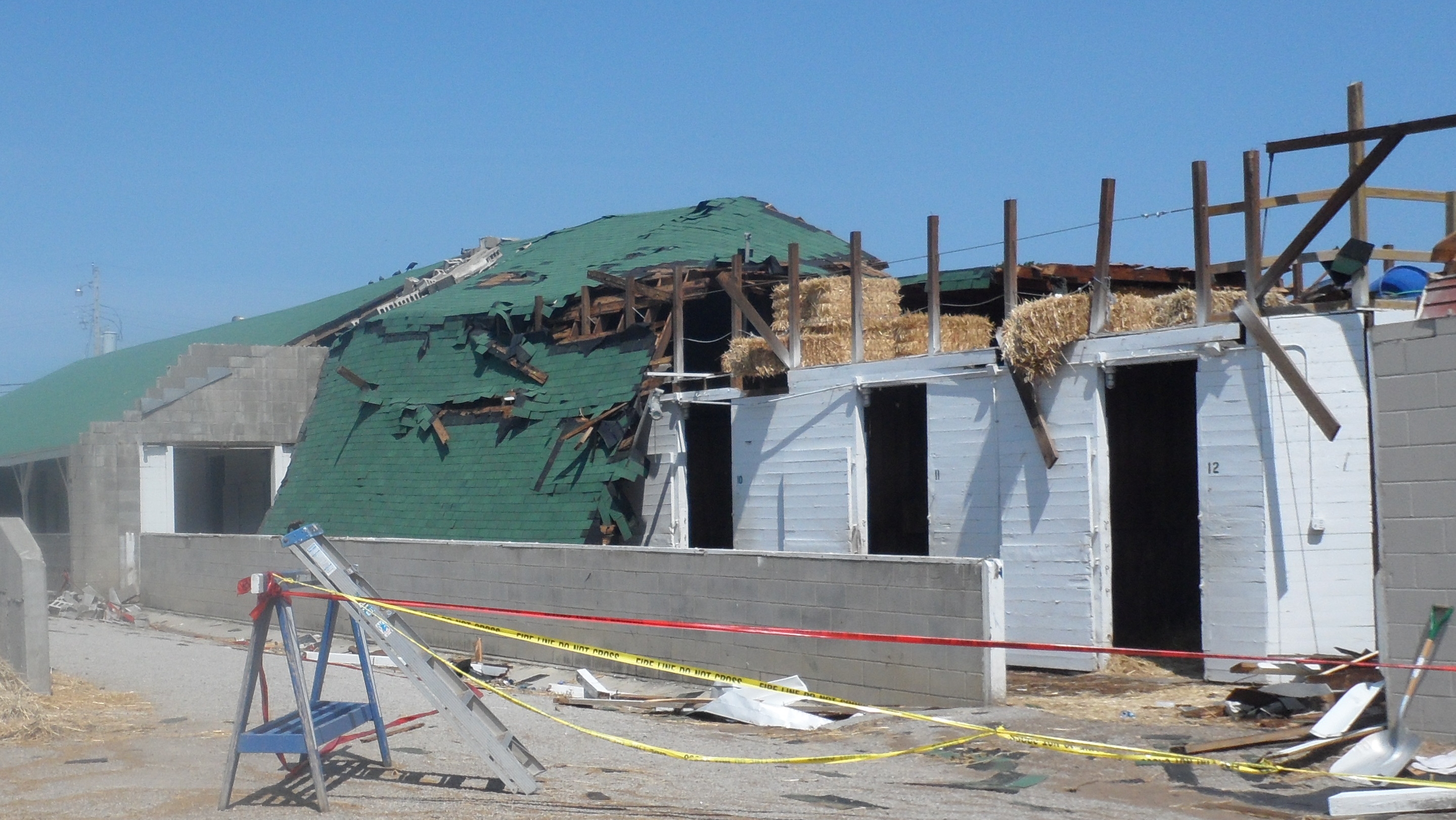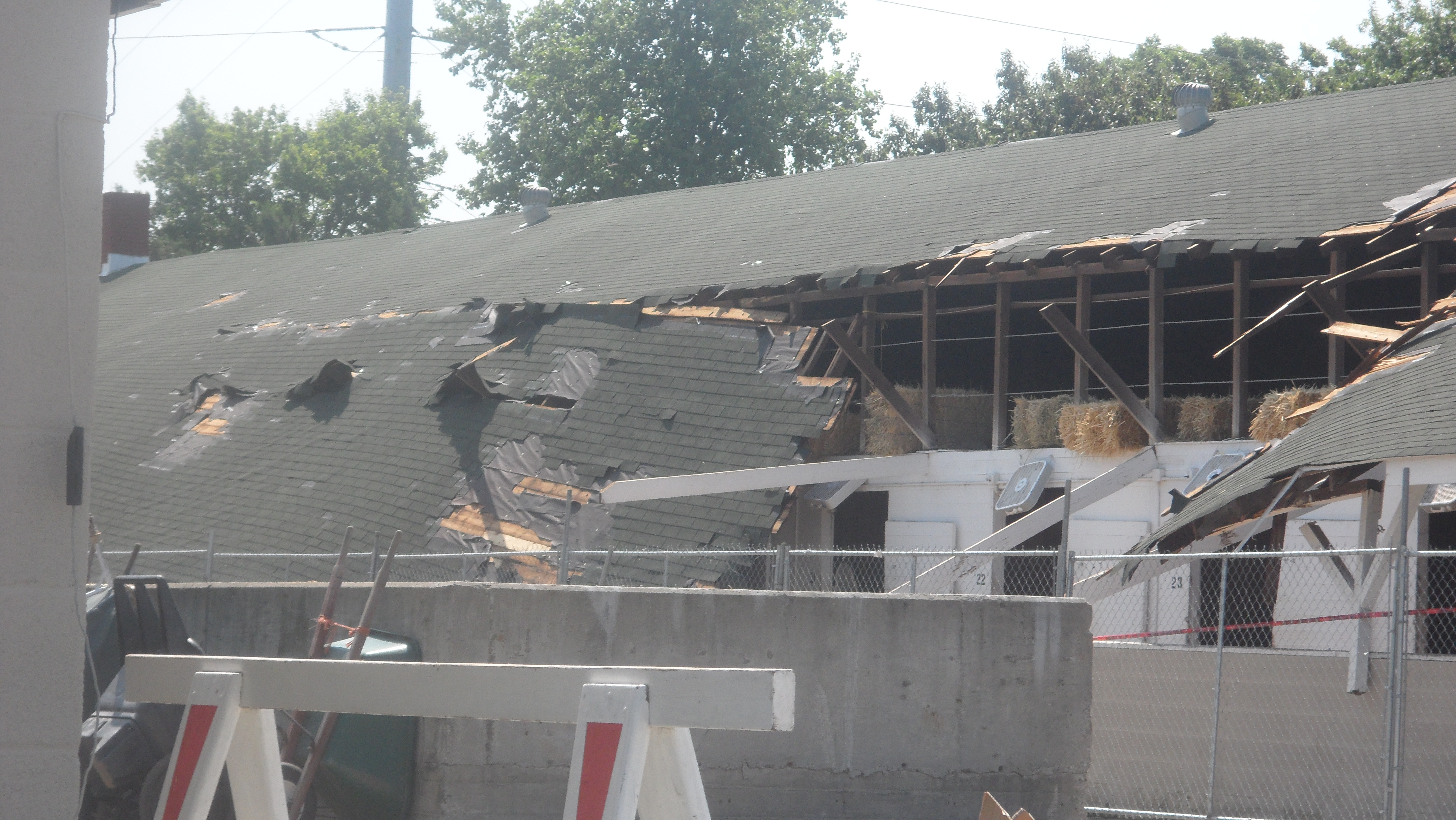 The tornado apparently made its way down the backstretch like an unruly two-year-old, leaping and touching down unpredictably and powerfully. Darren Rogers, senior director of communications and media services at Churchill Downs, told me that it first hit at the beginning of the one-mile chute, moving relatively straightly down the backstretch. It was, according to Rogers, a narrow tornado, which limited the damage it inflicted. More than once I saw a barn in pieces next to one completely untouched. Click on photos enlarge.