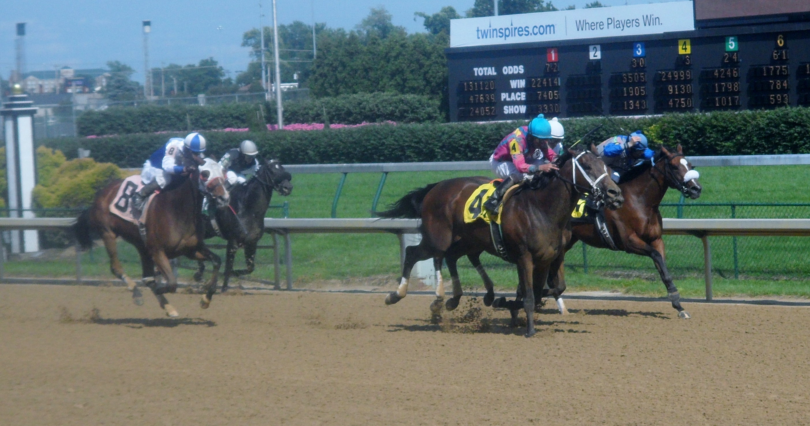 Saturday at the races was gloriously sunny and warm, and on the track, a four-year-old half sister to Shackleford made her second start for trainer Dale Romans. After breaking her maiden for him earlier this month, Afleeting Lady finished second in an allowance race on Saturday. Sired by Afleet Alex, she’s owned and bred by Michael Lauffer and William Cubbedge, the same men who bred and own the Preakness winner; the filly made her first five starts for trainer Tom Albertrani.