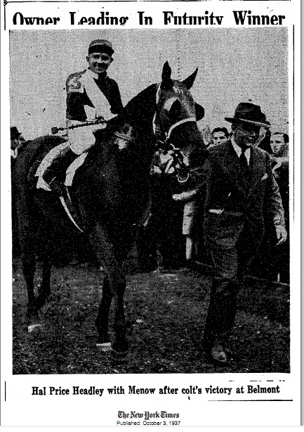Interesting connection: Kurtsinger in the irons on War Admiral in the Mass. ‘Cap, had ridden Menow to victory in the Champagne and the Futurity. He probably knew better than any of the big crowd at Suffolk Downs how hopeless his situation was when Menow shot to the lead. He is credited with being the first to be aboard for victories in the Kentucky Derby, Preakness, Belmont and Futurity in the same year. War Admiral in ’37 was Triple Crown winner.
