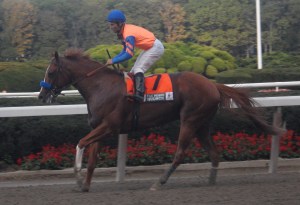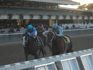 In six starts this year, Hessonite is 4-1-1; her win in yesterday’s Ticonderoga gives her victories over all three of Belmont’s surfaces. Coming back just 12 days after running second in the Pebbles, she raced comfortably towards the back of the pack, coming very wide around the final turn to cruise down the middle of the racetrack and racing eyeball to eyeball with favored Gitchee Goomie before drawing away for the win.