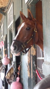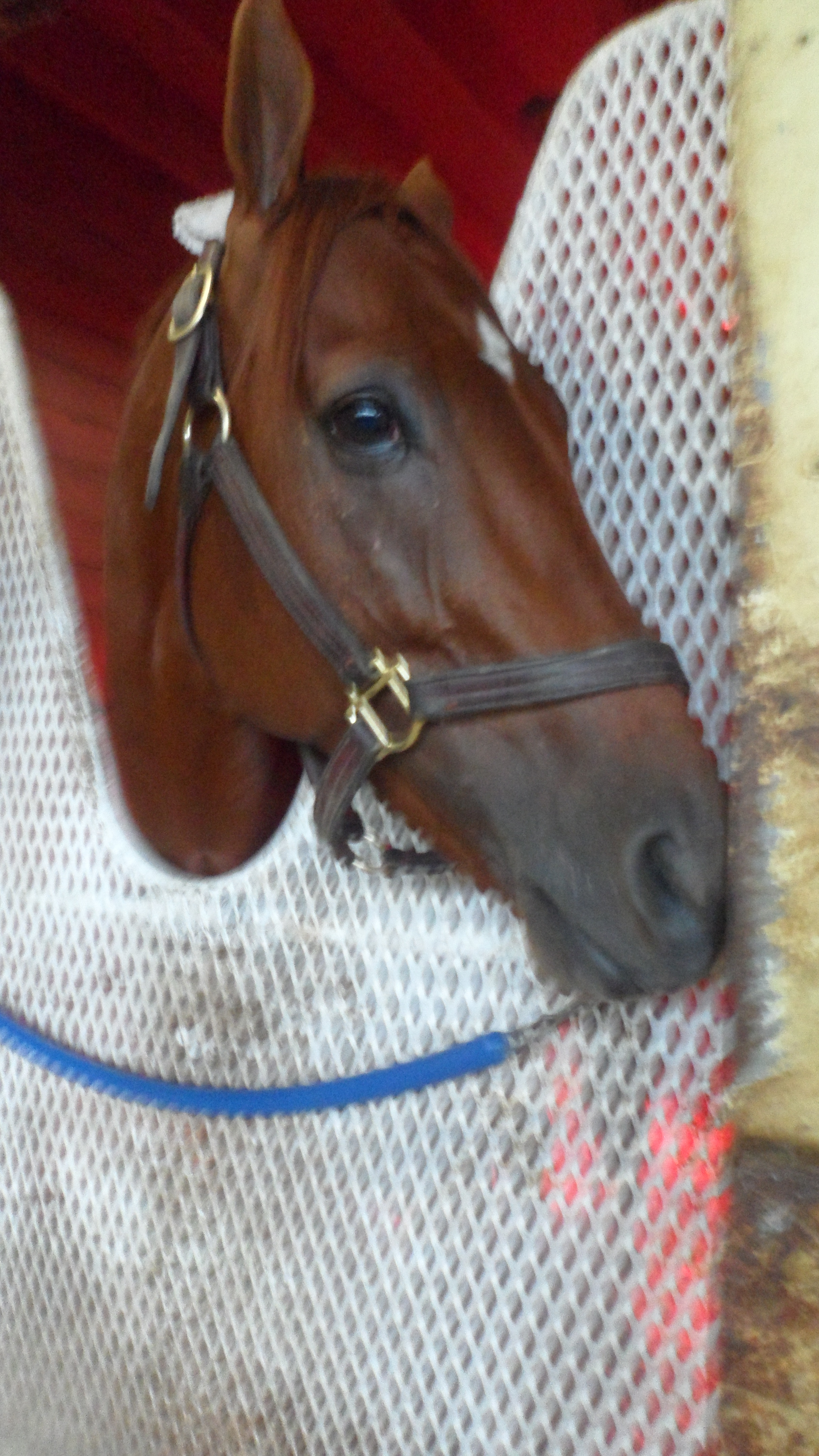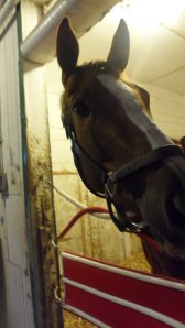 On Sunday morning at the barn, Hessonite welcomed visitors, though she was not particularly cooperative when it came to photographs.  Donk’s wife Fay said that between Saturday and Sunday morning, the filly had consumed a significant quantity of peppermints, but her appetite for treats was not sated: the crinkle of a wrapper elicited pricked ears and nosy curiosity.