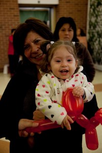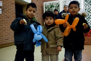 Dozens of volunteers acted as Christmas elves, escorting students through the room and wrapping and labeling packages; as children waited to come inside, they were entertained by a balloon sculptor and ate donated cookies and Christmas treats.