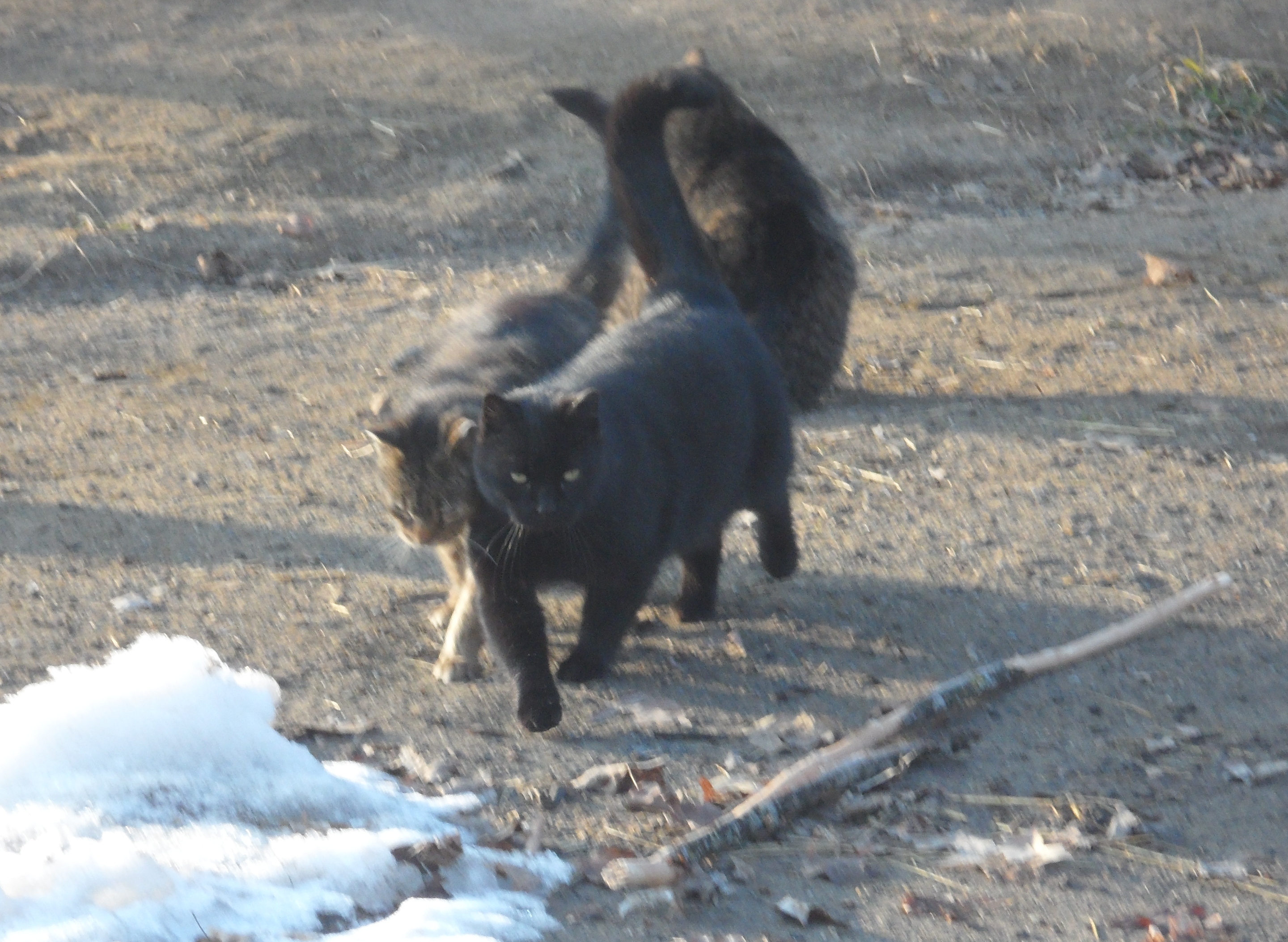 As she puts down the food, several cats swoop in immediately; others stand off a bit, awaiting our departure. We have barely closed the car doors when they descend.