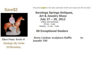 July 27 – 29:  The Saratoga Springs Antiques, Art, and Jewelry show will be held at the City Center. Admission is $10, and attendees will find ceramics, fine art, jewelry, furniture, and home accessories among many other items.  A special exhibit will highlight the influence of the horse in art throughout time, and a raffle of a Royal Worcester horse figurine by Doris Lindner will be held to benefit the Thoroughbred Retirement Foundation. The figurine was manufactured in 1973, and, #124 of a limited edition of 750, its retail value is $1,500.