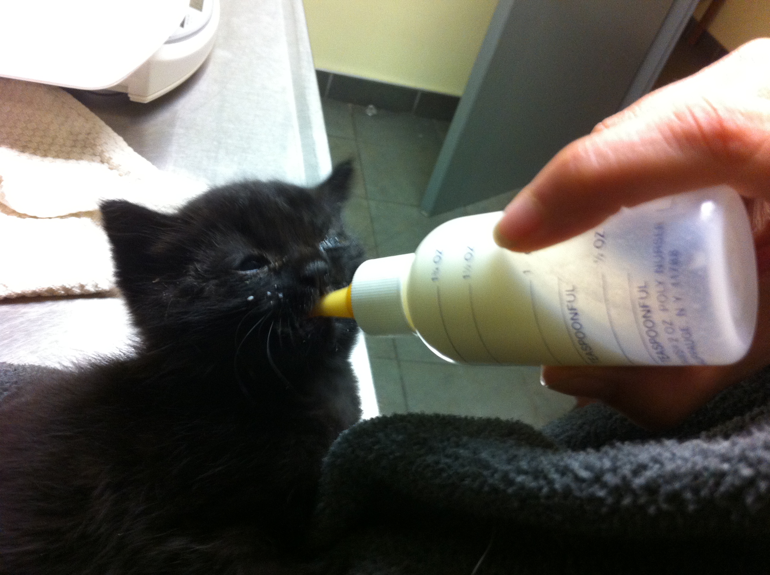 Miraculously, he was still there a couple of hours later when I drove out to Rockaway to see if I could find him, nestled between the garage and a fence, sleeping among shards of broken glass, no feline relatives nearby…but that was far less miraculous than the fact that he had survived at all, on a street down which, three and a half days earlier, boats had made their way along flooded streets, and entire houses had been swept away. The vet said that he was about five weeks old, and though we started him with a bottle, he was more than happy to give it up for the kitten food we gave him just a few minutes later.