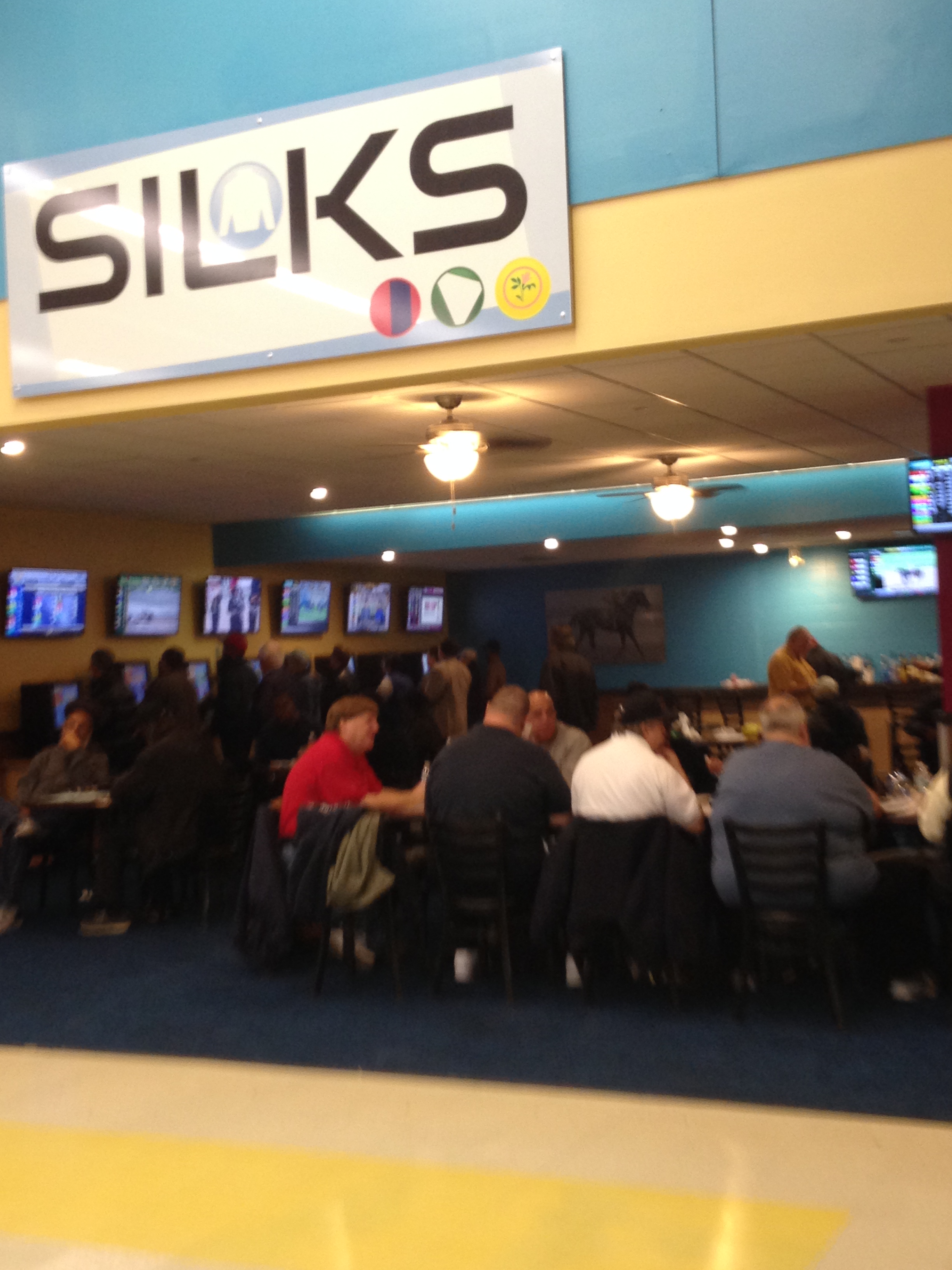 Longshots opened last April, with free admission for NYRA Rewards customers and the promise of food service. Six months later, NYRA Rewards customers are charged $5 to get in, and the only food on offer appears to be potato chips, though I am told that it might be possible to order from a limited menu of sandwiches.  A scan of the place mid-card didn’t reveal anyone taking advantage of that opportunity (though down in Silks, one enterprising group had taken it upon themselves to bring in a pizza).