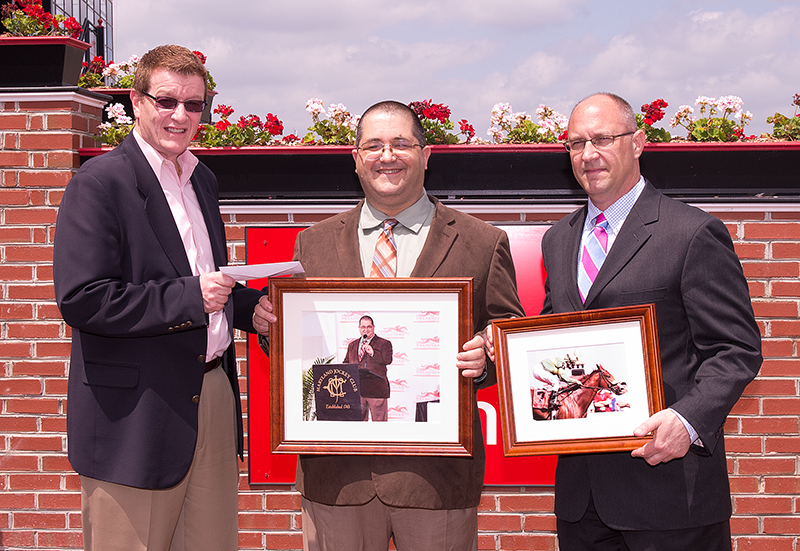 Gathagan (right) and former Maryland Jockey Club president Tom Chuckas present Frank Carulli with parting gifts. Photo by Jim McCue, Maryland Jockey Club.