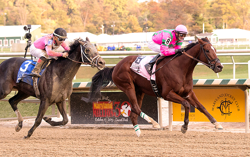Phlash Phelps and Victor Carrasco take the Maryland Million Turf. Photo Jim McCue/Maryland Jockey Club